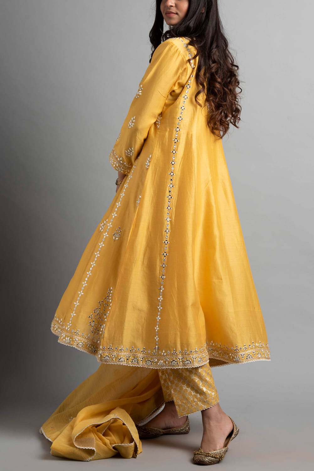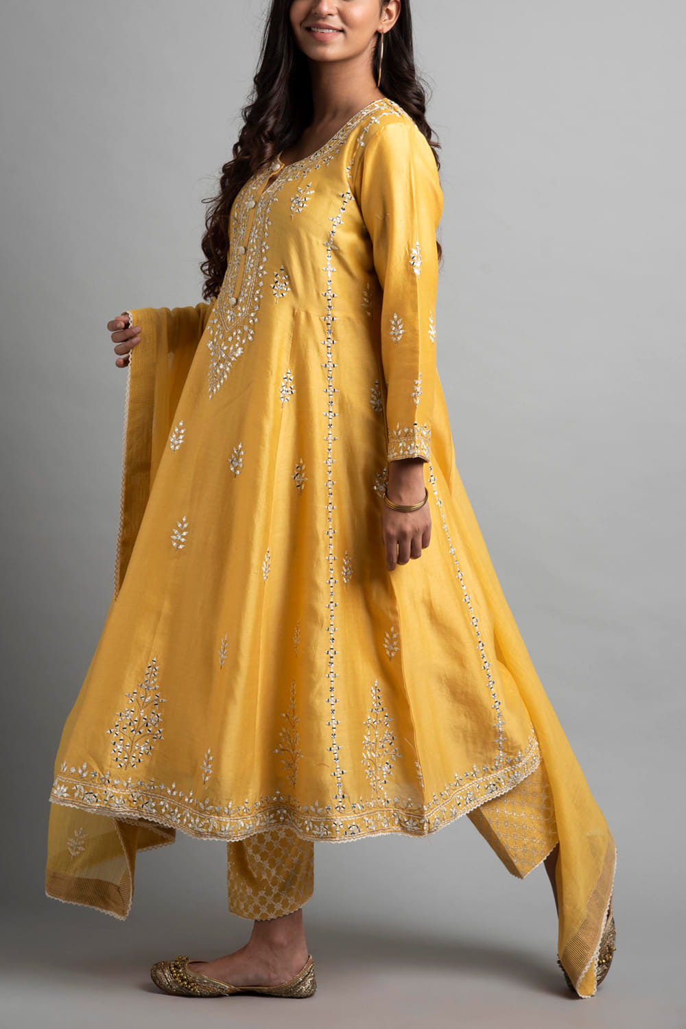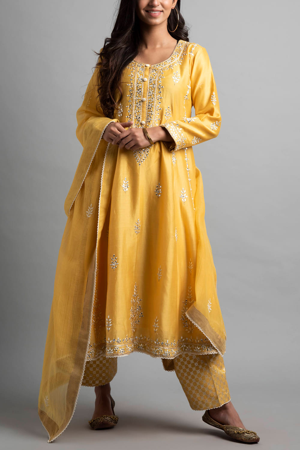 Heena Kochhar designs a vibrant festive look with this chanderi kurta set primped with aari work and mirror embroidery adorning the neckline and hem. Style the look with chic juttis and a wristlet.