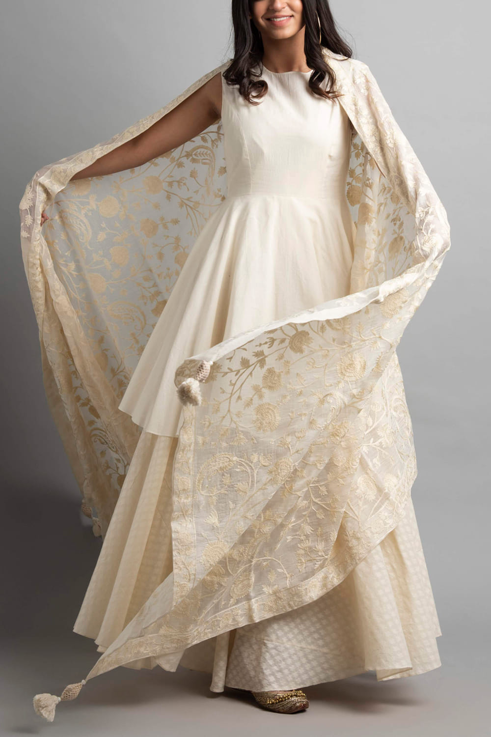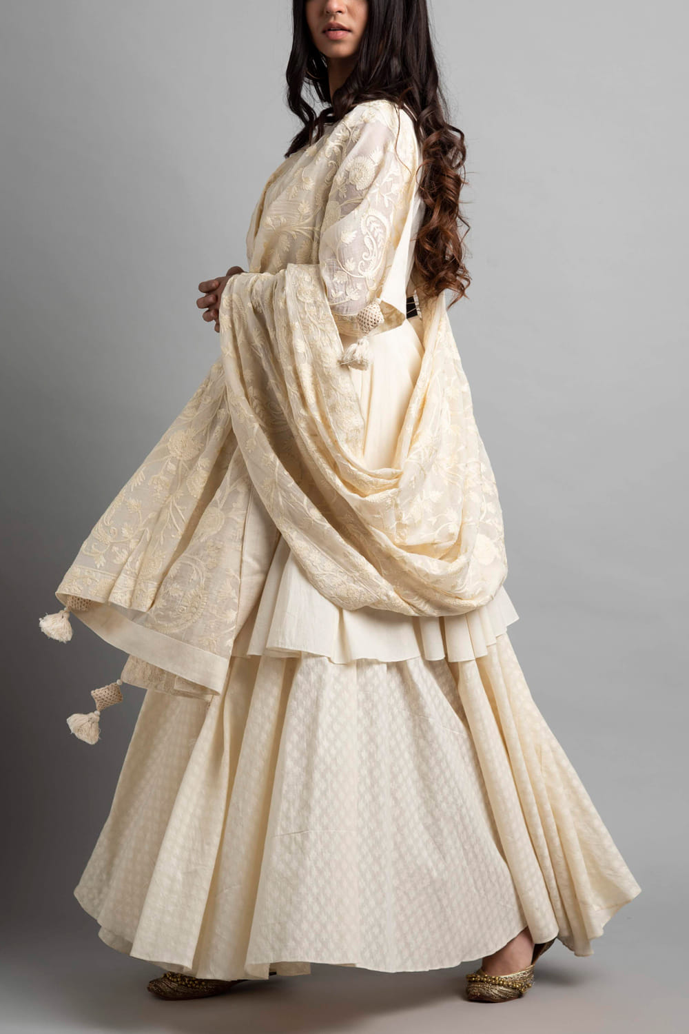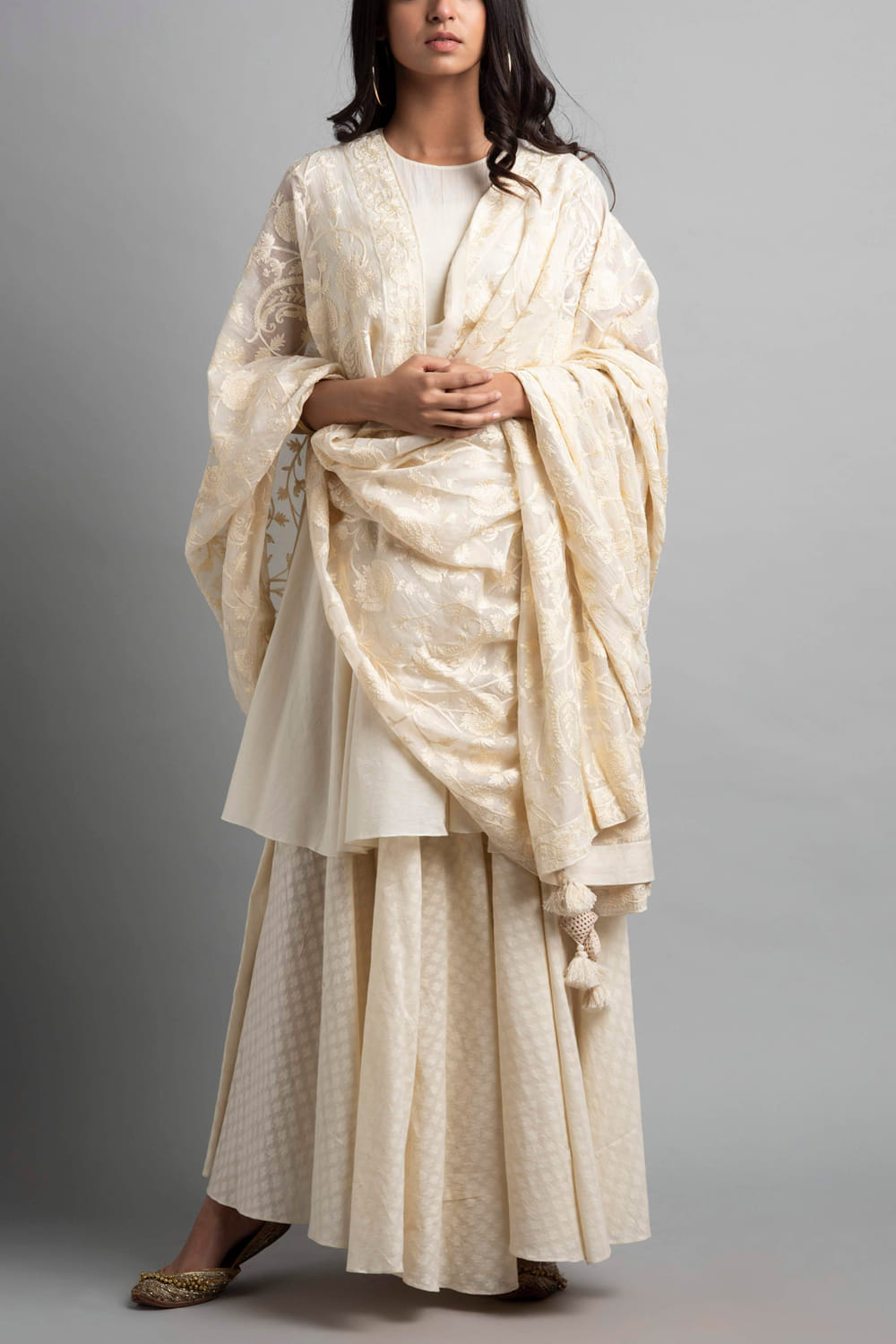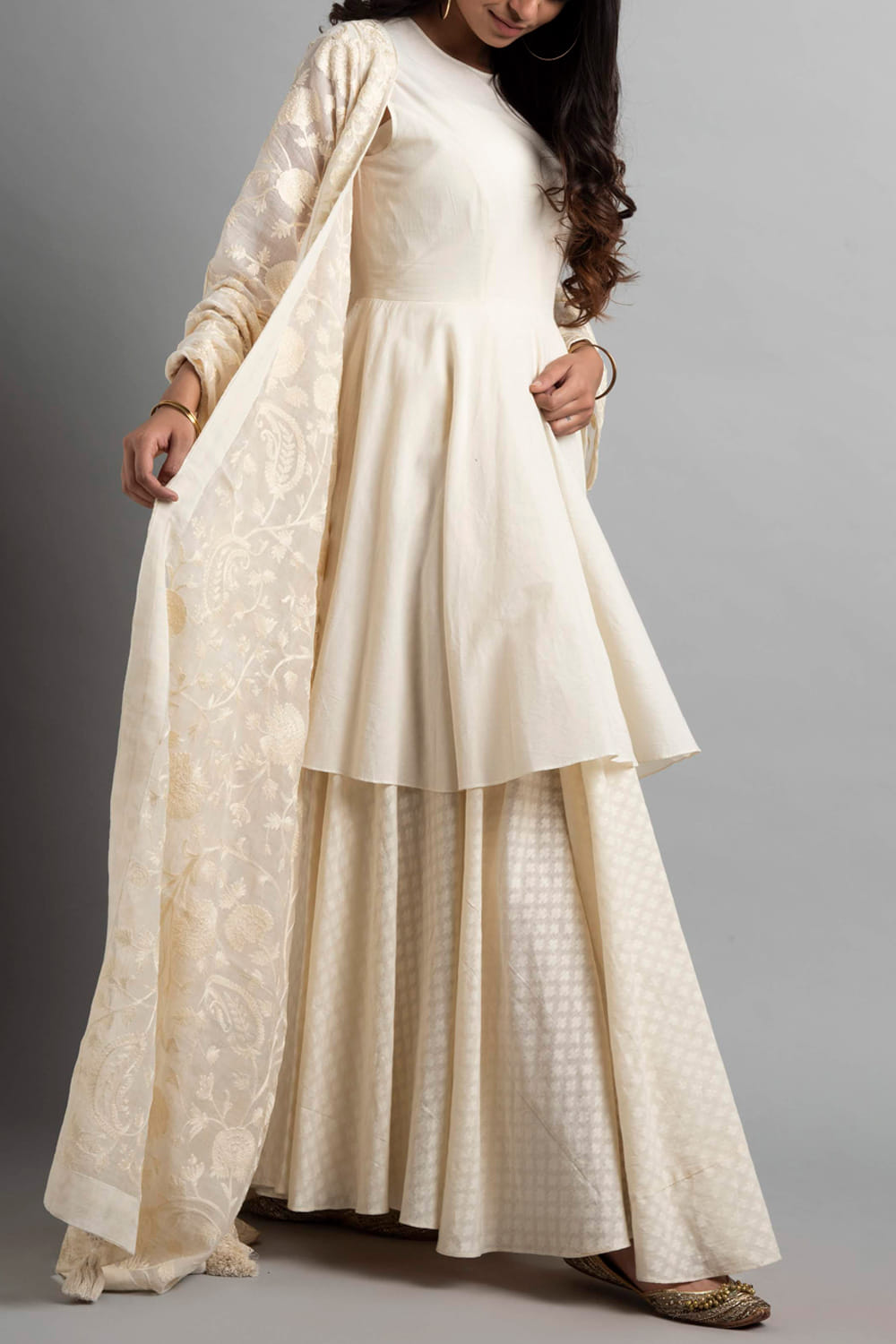 Heena Kochhar designs an effortlessly alluring ethnic look with this flared kurta and palazzo set primped with rich resham and aari embroidery, complemented with a chanderi dupatta. Style the look with statement earrings.