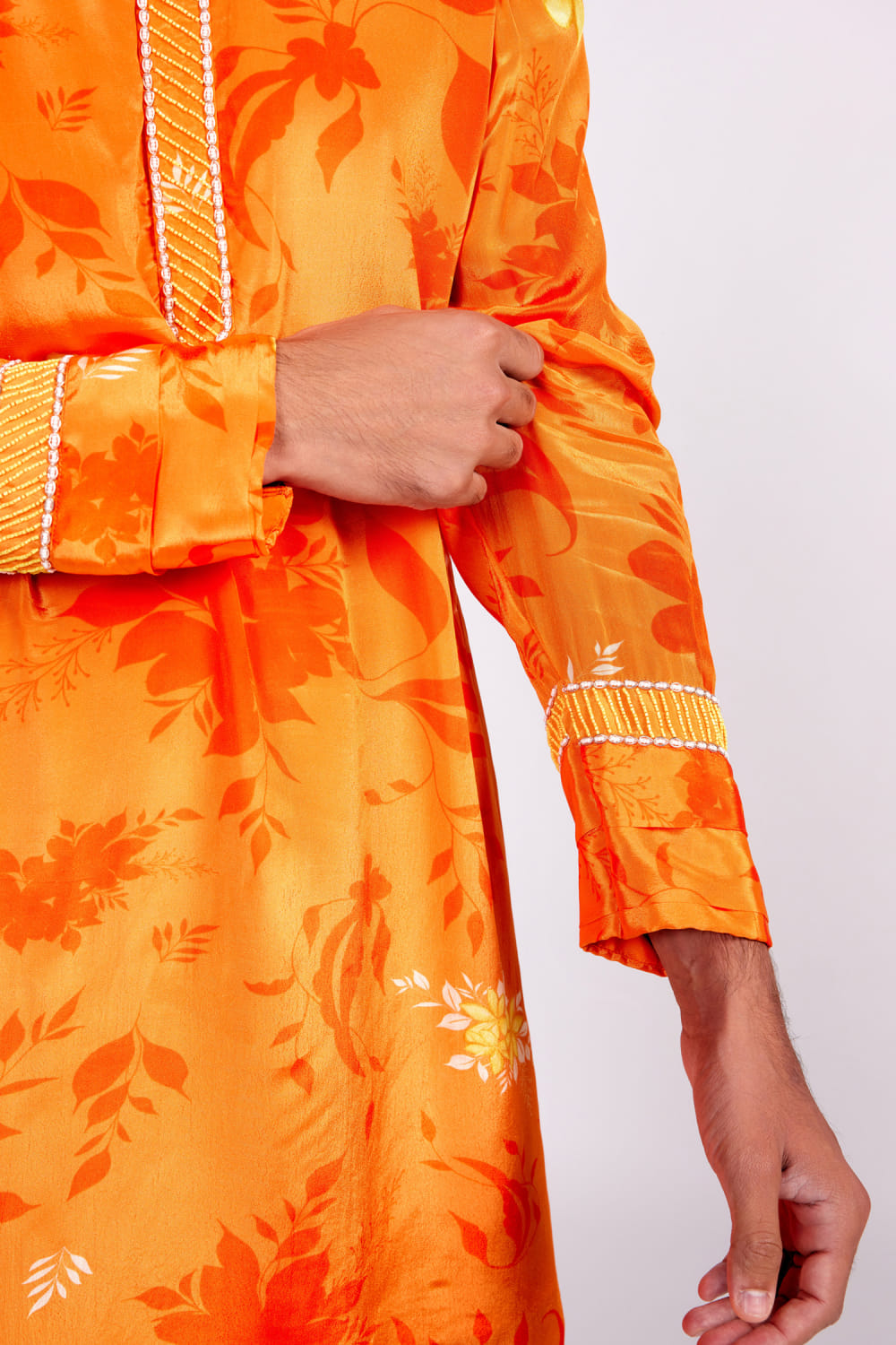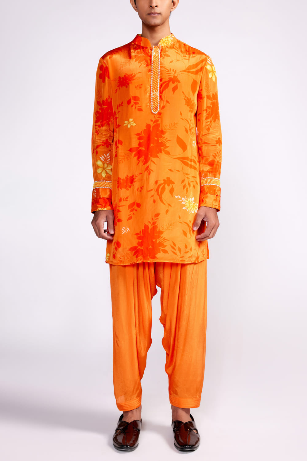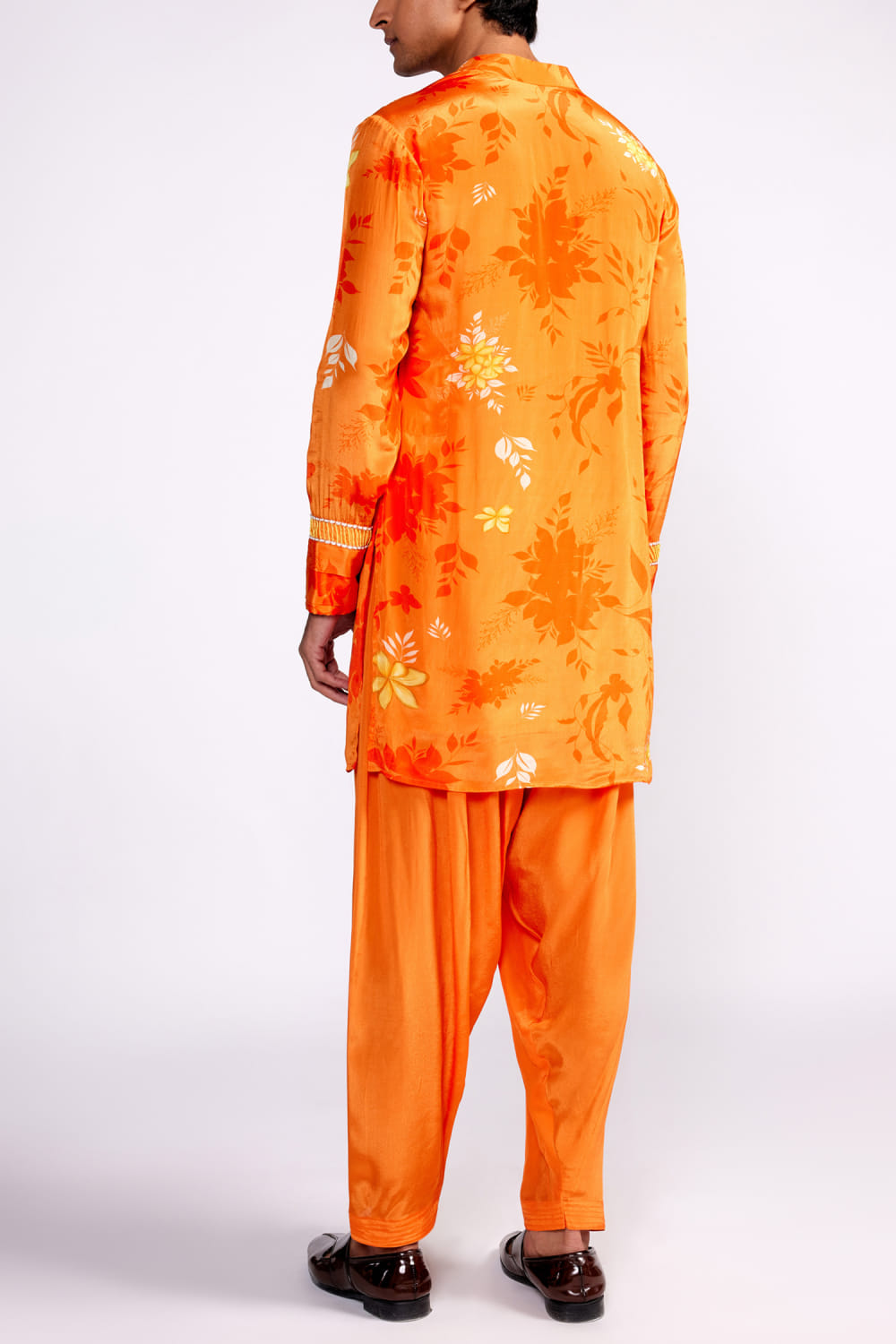 Isha Gupta Tayal designs this vibrant kurta embraced in crepe with floral and leaf prints featuring delicate embellishments and embroidery detailing, teaming it with matching salwar pants. Style the look with mojris for festivities.
