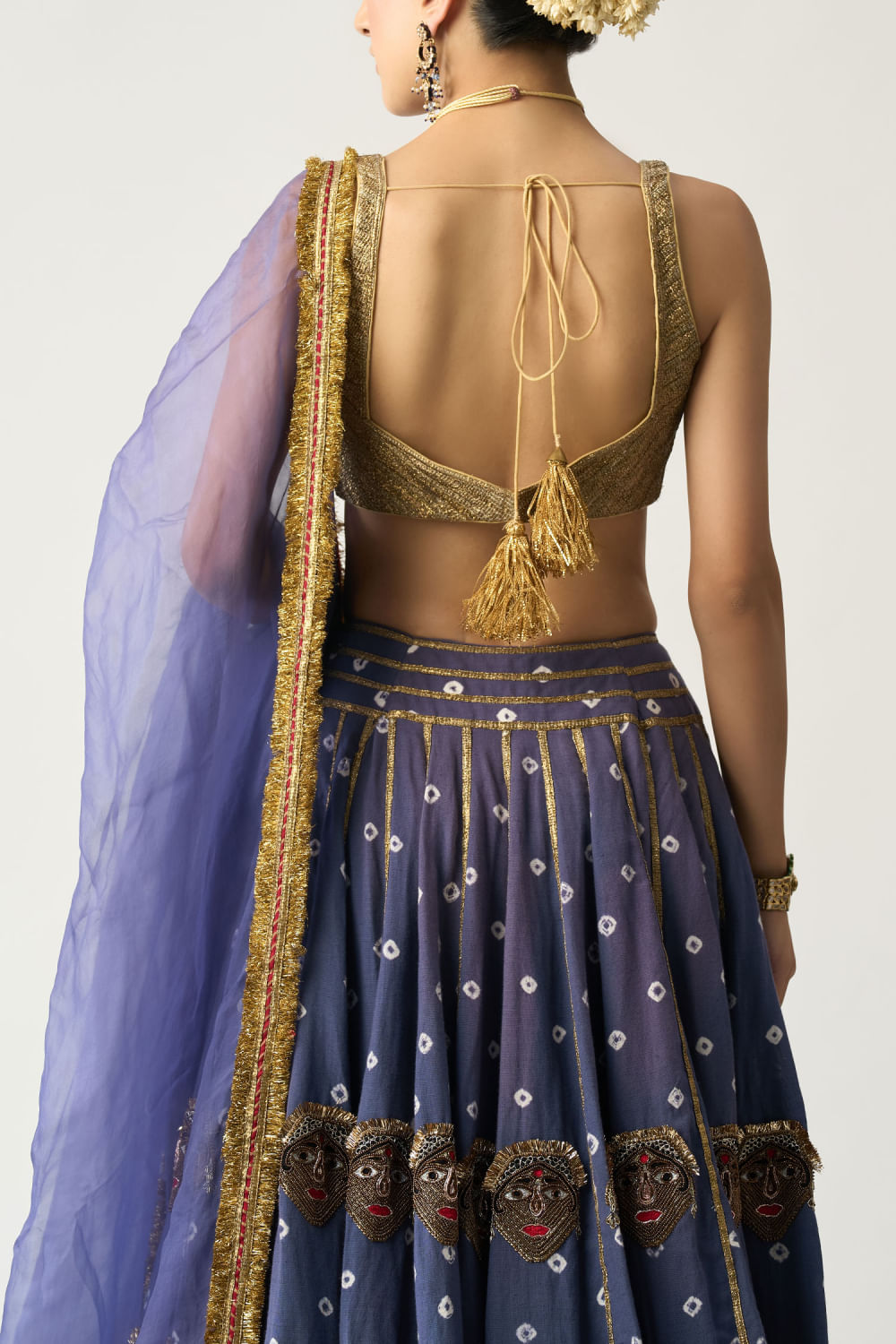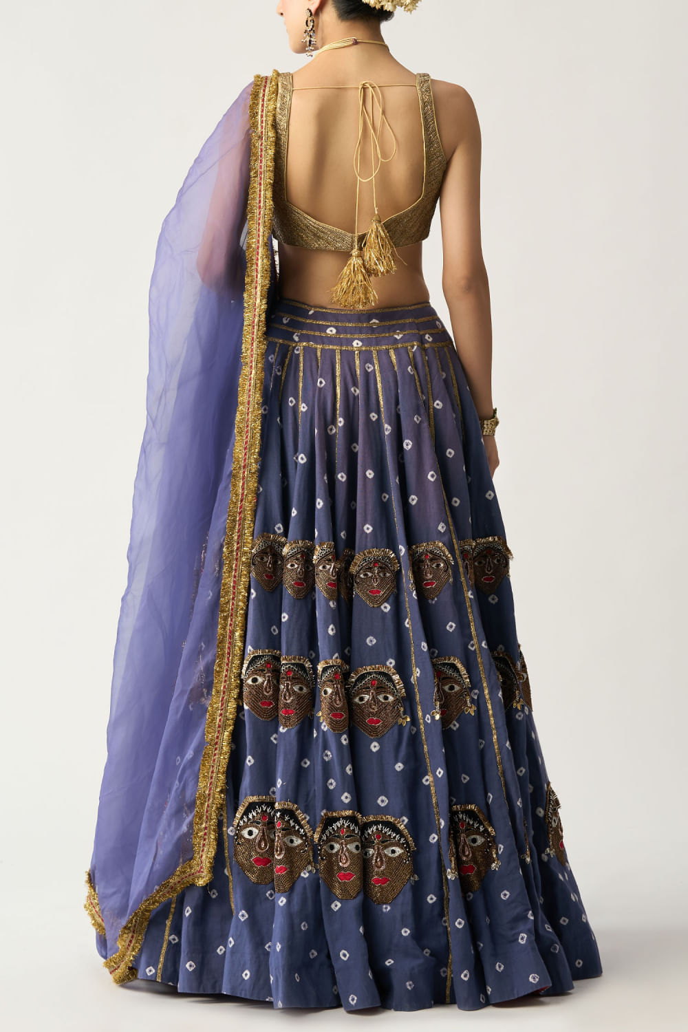 Itrh designed this stunning linen lehenga with a bandhani pattern and lampi stripes embellishments, featuring hand embroidery and handmade animal puppet detailing, teaming it with a metallic blouse and an organza dupatta. Style the look with a kundan necklace set and a potli bag for a festive appeal.