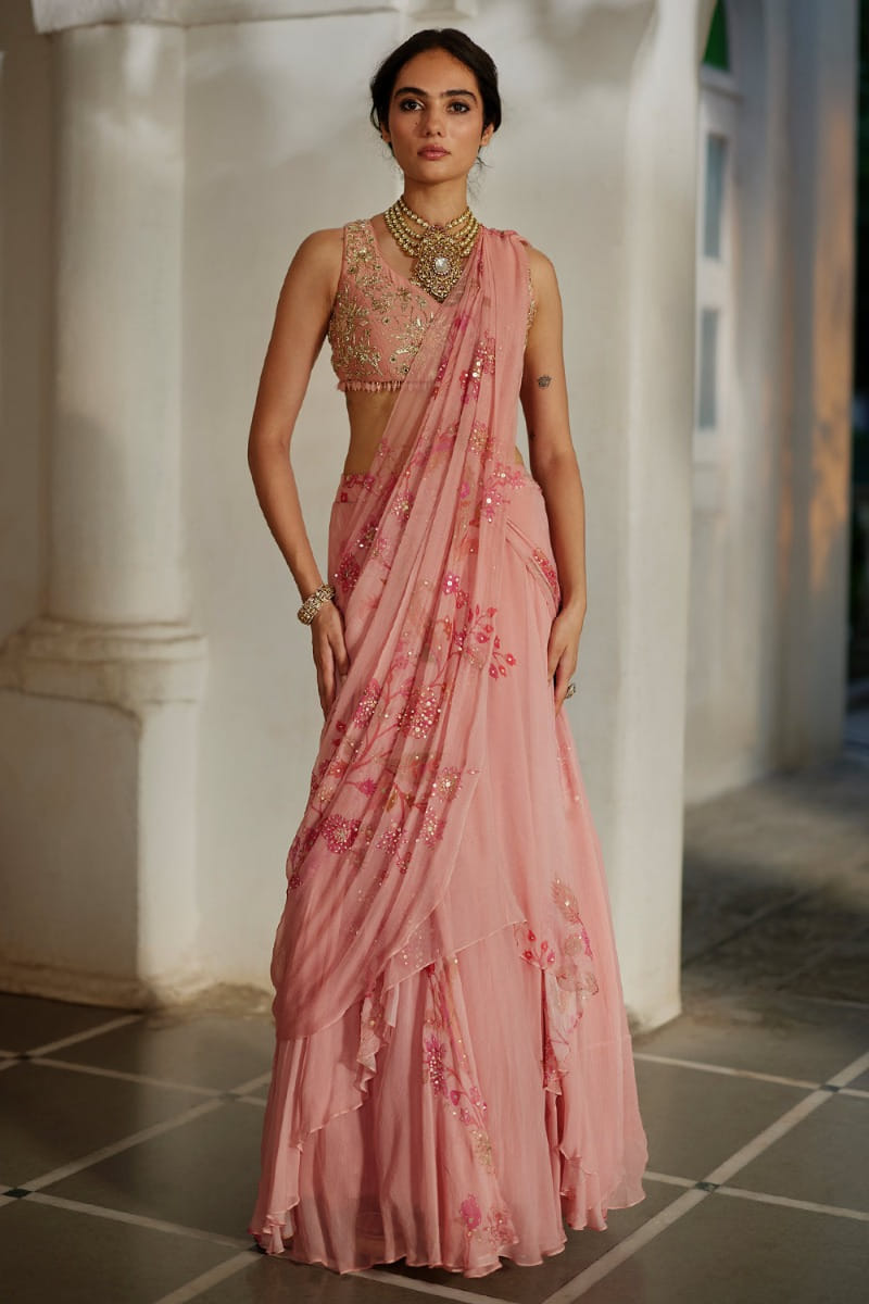 Itrh designs this vibrant silver jacquard striped cotton kurta with khadi block print, featuring zardozi and dabka embroidery. It is teamed with a silk chanderi sharara and lampi striped dupatta. Style the look with a pair of chandbaalis and a passa for pre-wedding festivities.