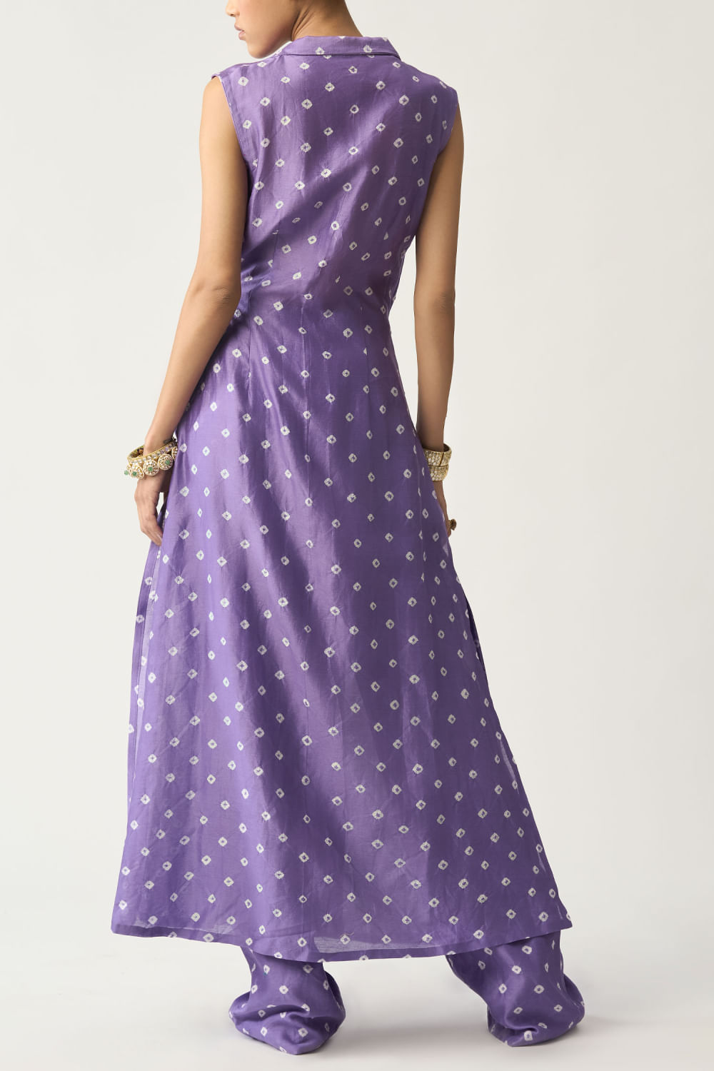 Itrh designs this style-ready bandhani jacket kurta in chanderi silk featuring tie-ups with handmade animal puppets, teaming it with matching pants. Style the look with a pearl necklace set for a charming look.