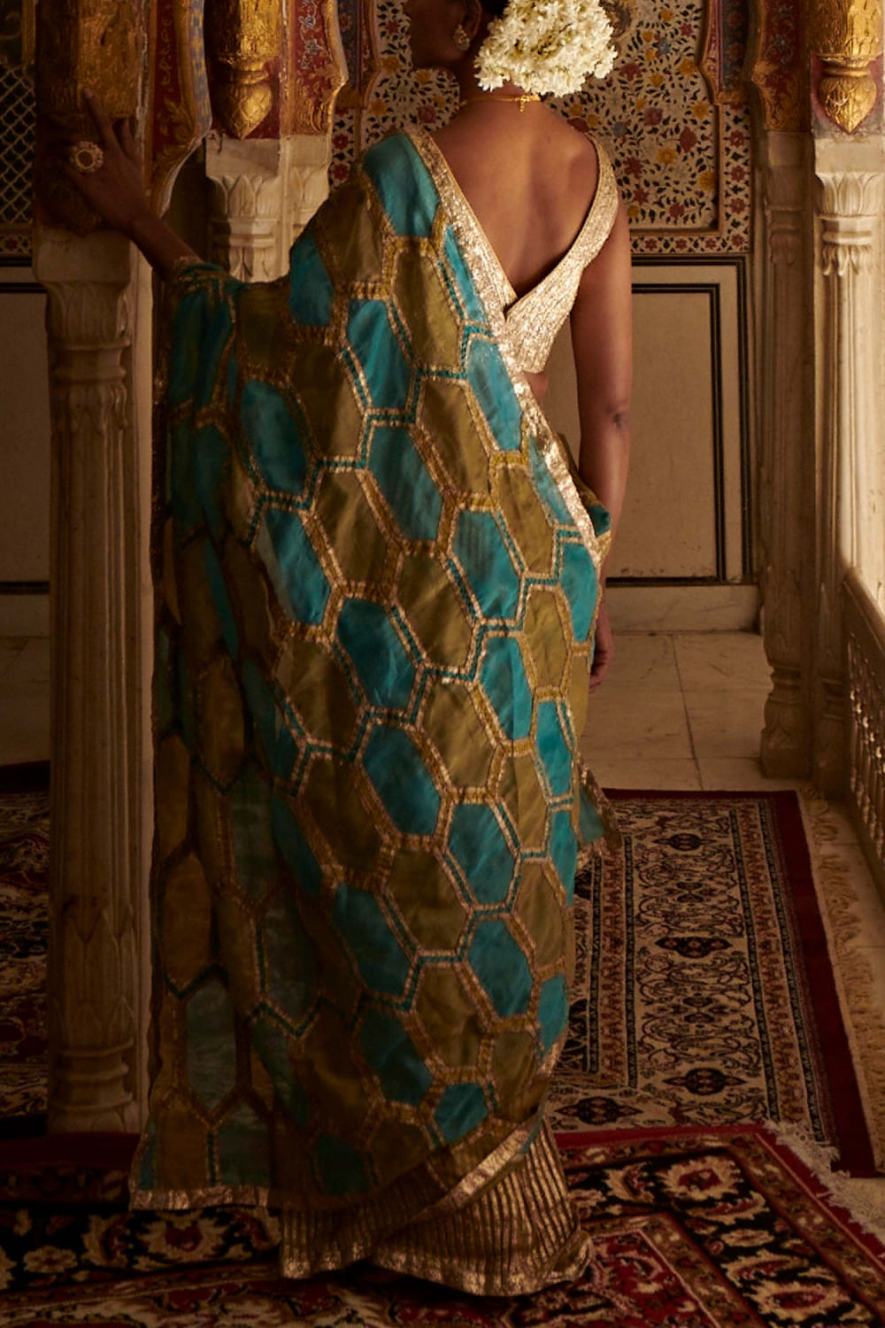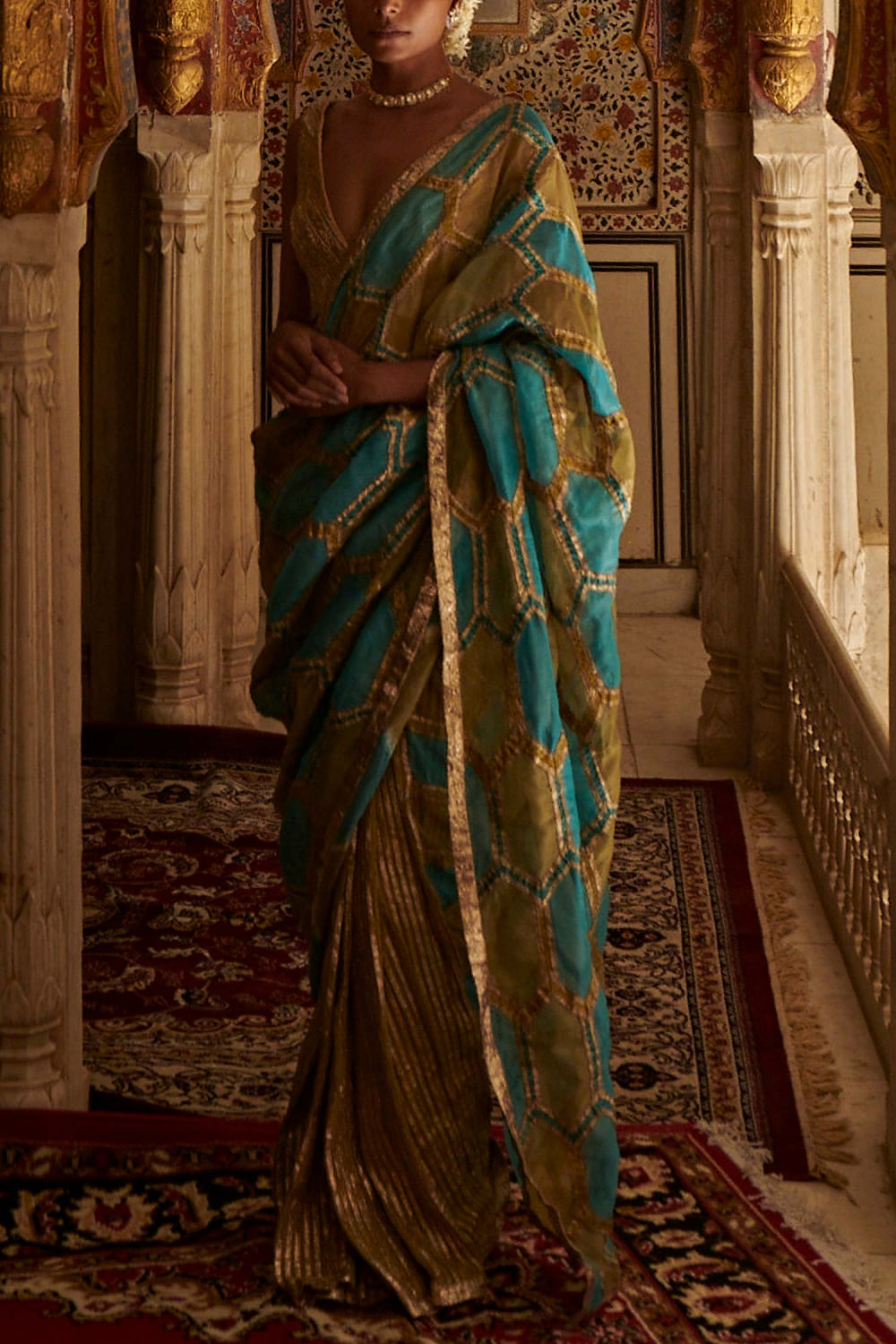 Itrh designs this dazzling sari in dual-tone with lampi work in honeycomb patterns. Style it with a polki necklace set and danglers. The blouse is shown for styling purpose only.
