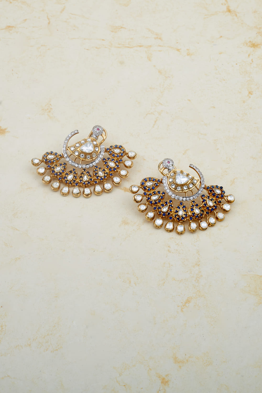 Ivorine designs this statement-making pair of sterling silver earrings crafted in a 22kt gold plating embellished with precious stones and moissanite polki in a peacock form. Style the look with a brocade lehenga ensemble for the occasion.