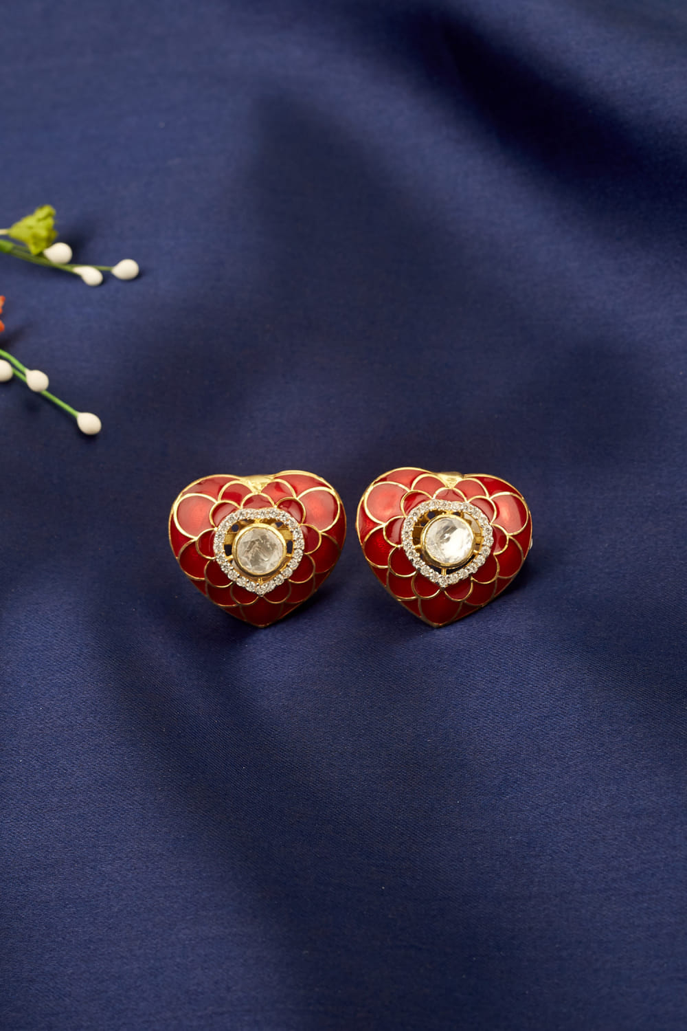 Ivorine designs this scintillating pair of 22kt gold-plated sterling silver meenakari studs encapsulated with precious stones, moissanite polki and red enamelled work in heart shapes. Style them with red co-ords for a romantic dinner.