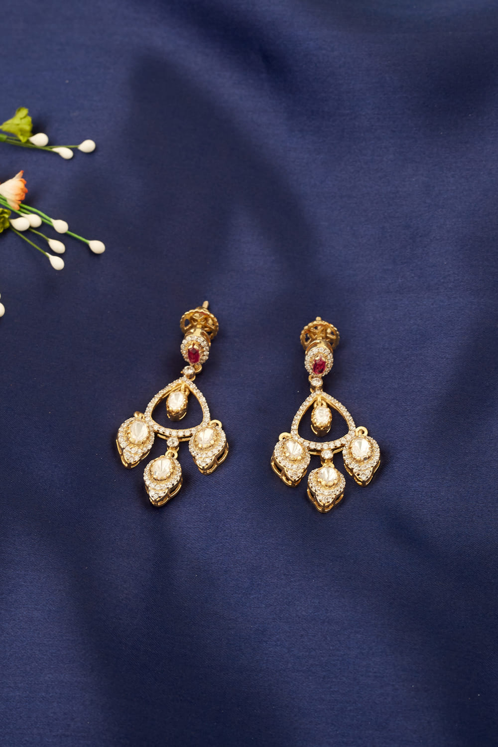 Ivorine designs this timeless pair of sterling silver danglers in 22kt gold plating laden with precious stones, ruby and moissanite polki. Accessorise them with a kurta set for a festive update.