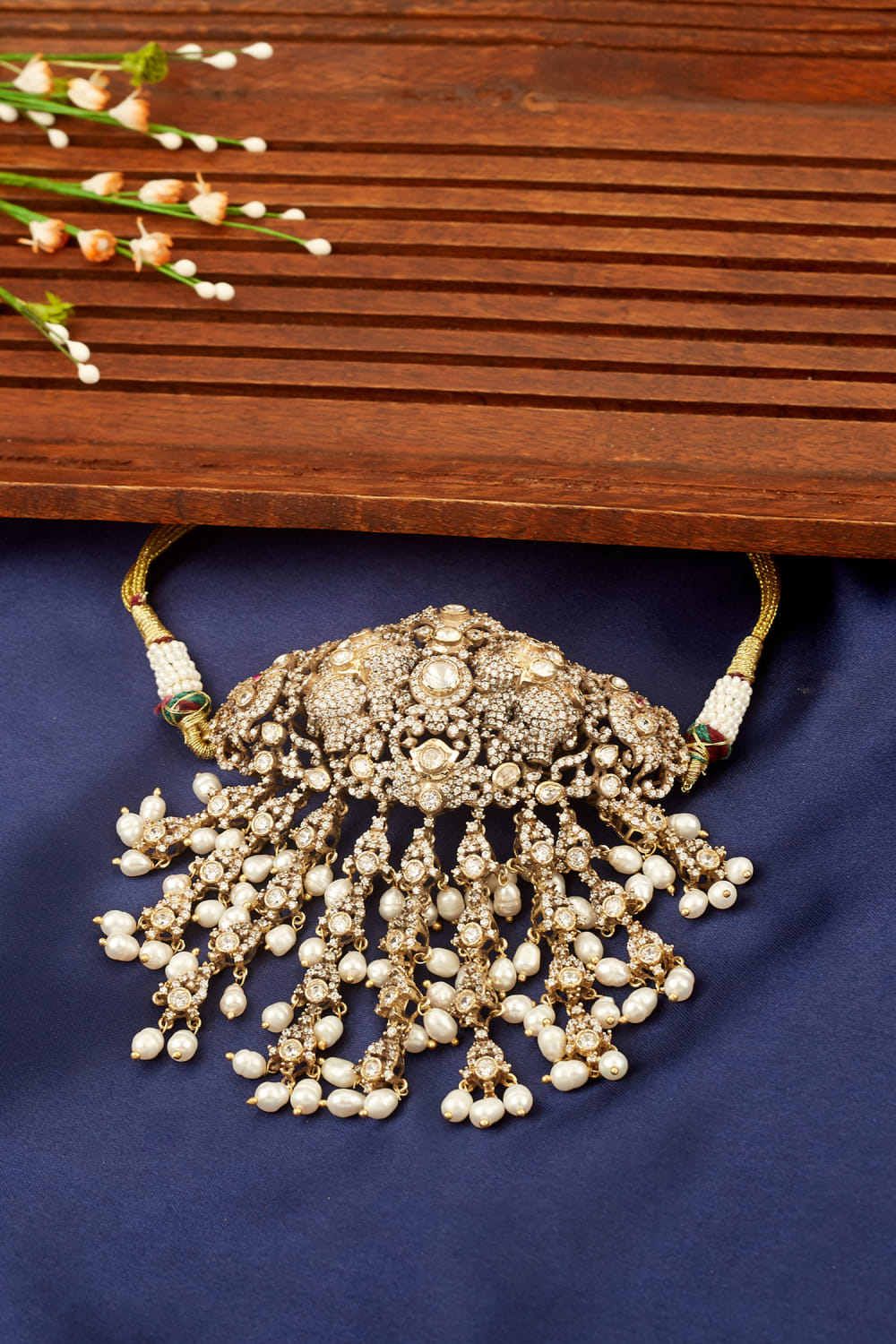 Ivorine designs this dazzling sterling silver necklace in a 22kt gold finish crafted with precious stones, gleaming pearls and moissanite polki, featuring elephant forms. It is teamed with a pair of earrings. Accessorise them with an embellished lehenga set for a wedding ceremony.
