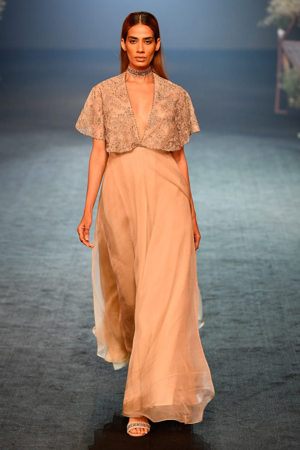 JADE by Monica and Karishma designs an ethereal gown handcrafted from organza with fine resham and kasab work. Style the look with a pair of swarovski danglers.