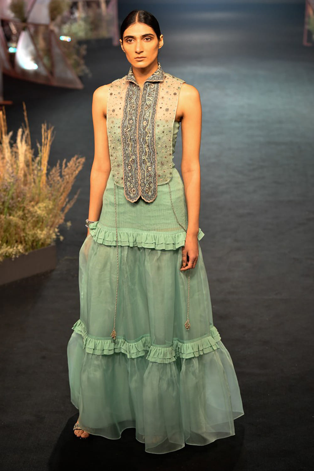 JADE by Monica and Karishma designs a party stunner with this gown customized with a richly embellished neckline and floral motifs embroidered in resham and kasab. Style the look with a embellished clutch.