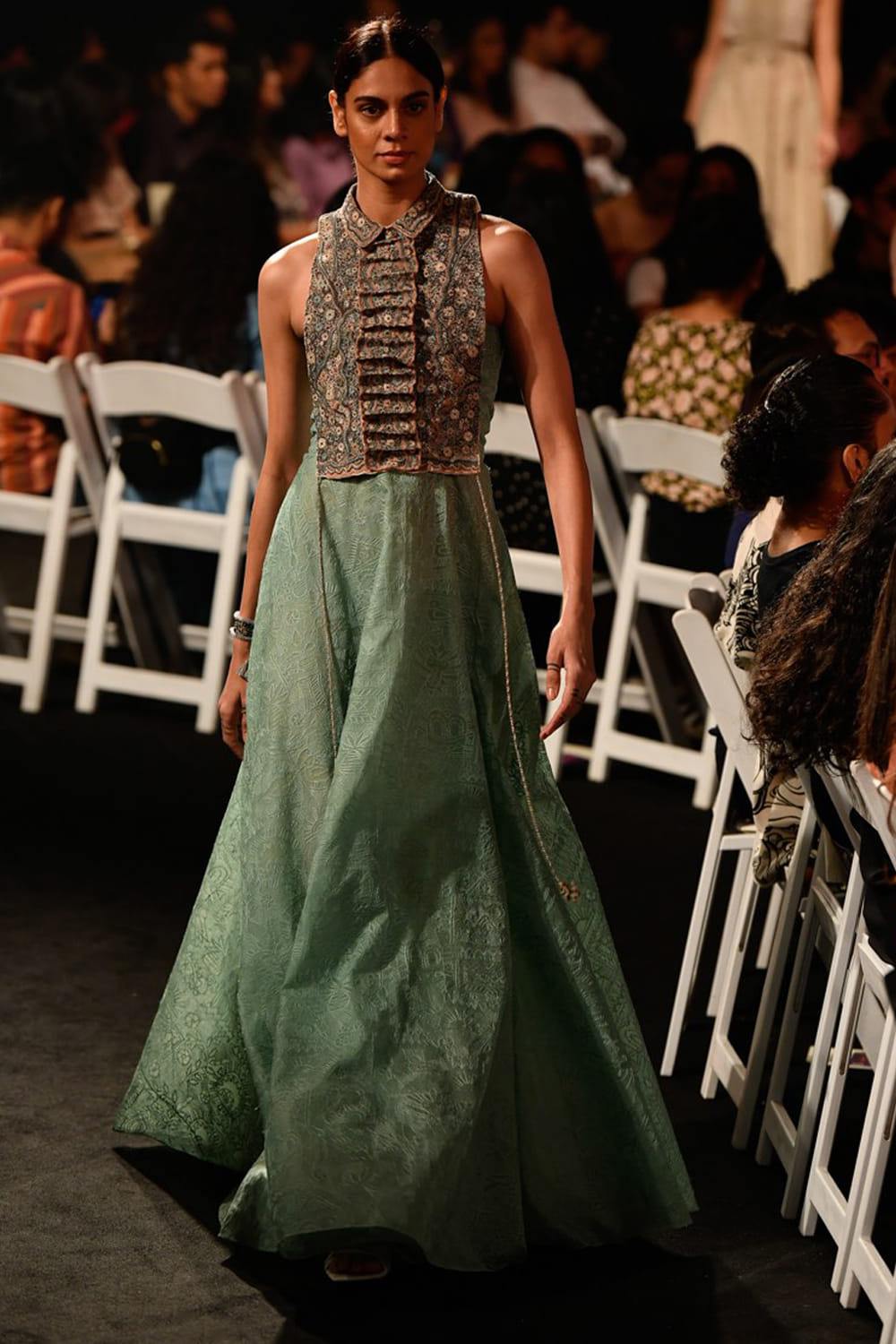 JADE by Monica and Karishma designs an alluring gown customized with a richly embellished bodice accented with kasab and resham work. Style the look with pearl jewels.