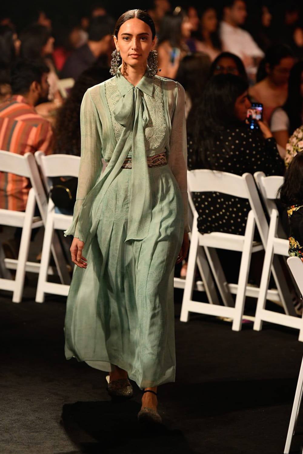 JADE by Monica and Karishma designs a breezy summer look with this bell-sleeve blouse paired with a printed skirt. Style the look with statement hoops.
