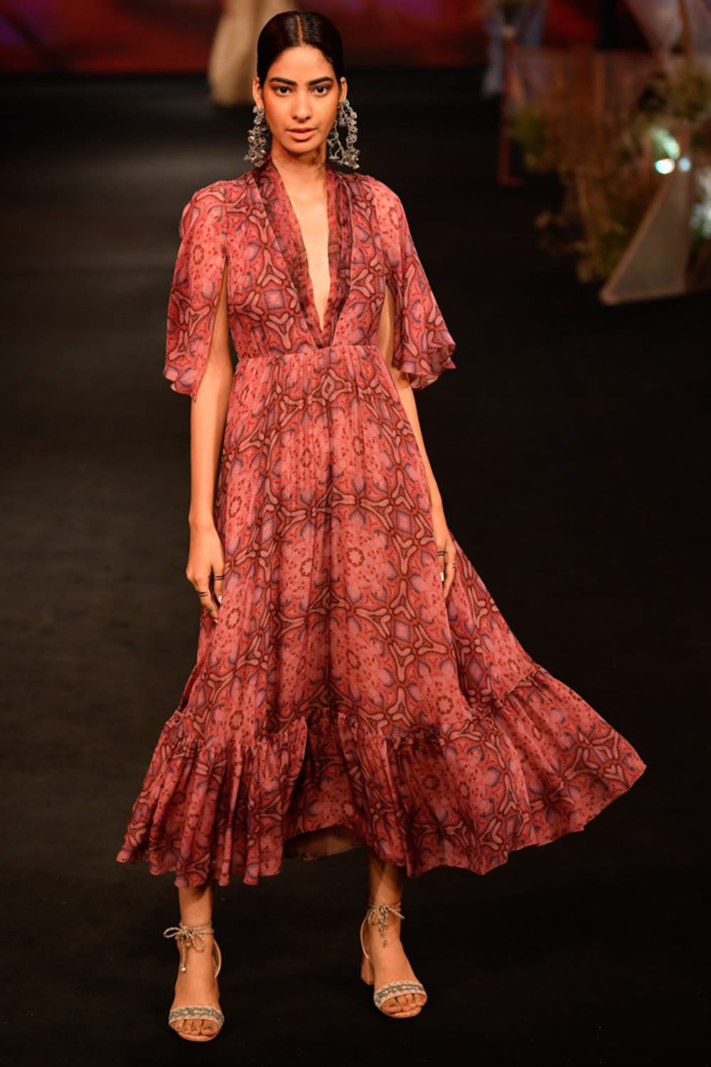 JADE by Monica and Karishma designs a breezy party look with this floral printed gown. Style the look with a pair of bohemian earrings.