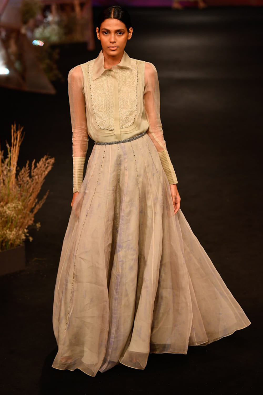 JADE by Monica and Karishma designs a wispy organza gown customized with tie & dye pattern and an embellished yoke. Style the look with strappy heels.