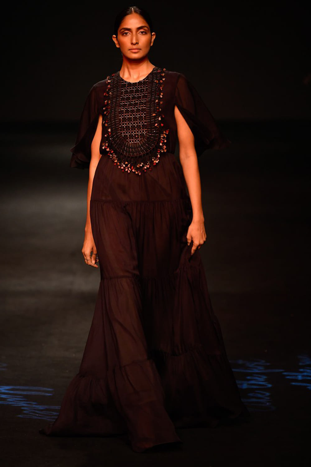 JADE by Monica and Karishma designs a chic black chiffon gown paired with a stylised bib. Style the look with a pair of statement earrings.