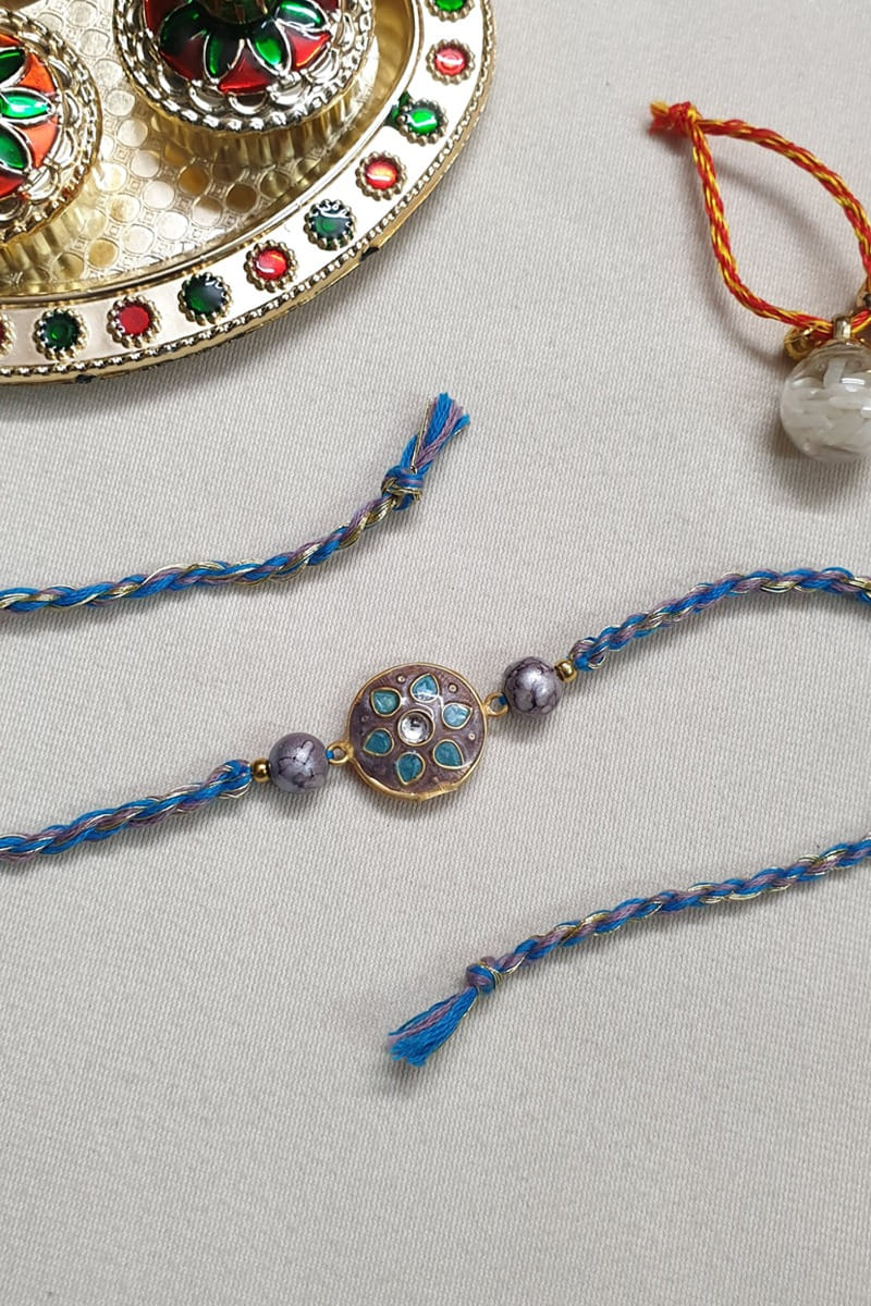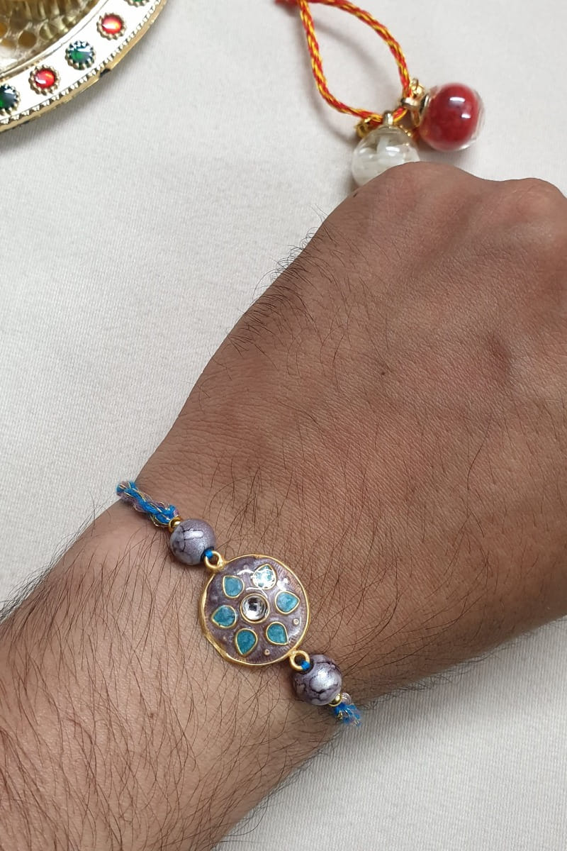 Jaipri designs this awe-inspiring rakhi for your brother rendered in brass encapsulated with intricate kundan and meenakari work in a floral shape. It is teamed with a roli-chawal.