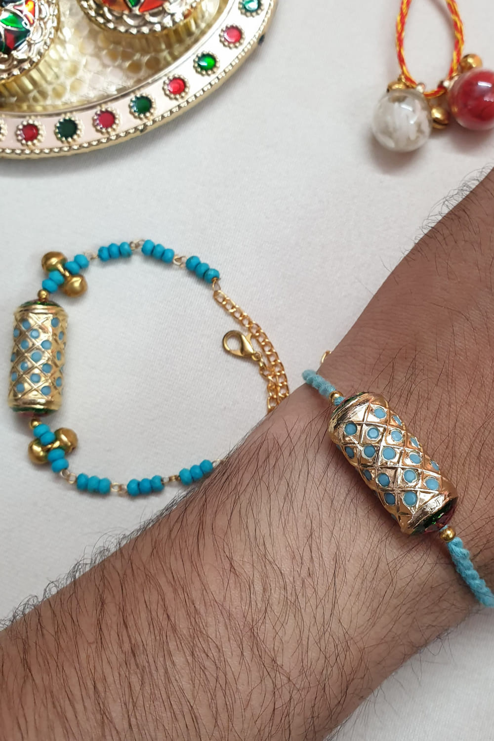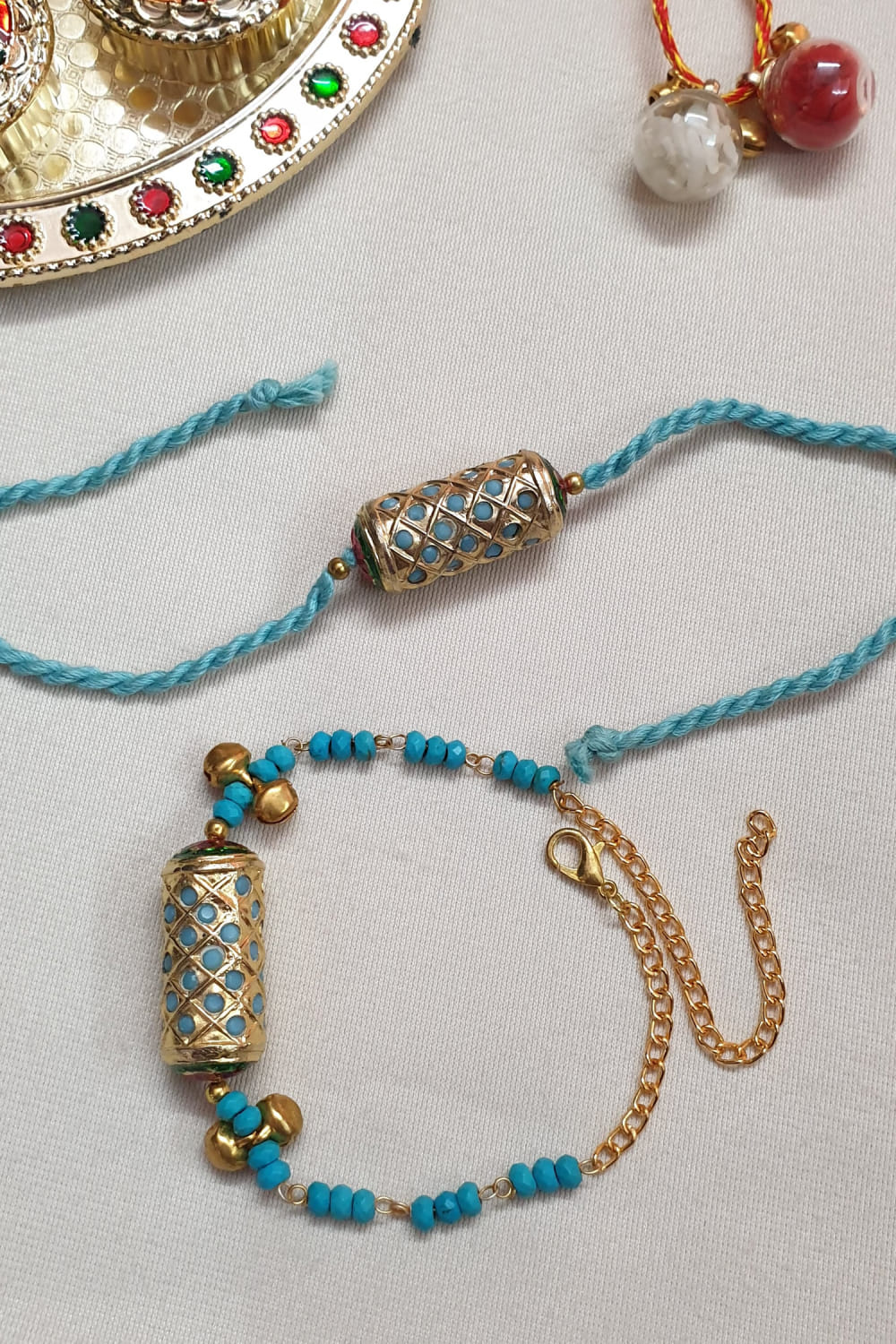 Jaipiri designs this pair of eye-catching rakhis for your brother and sister-in-law customised in brass encrusted with intricate detailing featuring jadau work and bead embellishments. They are teamed with a roli-chawal.
