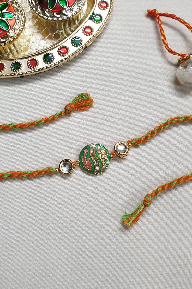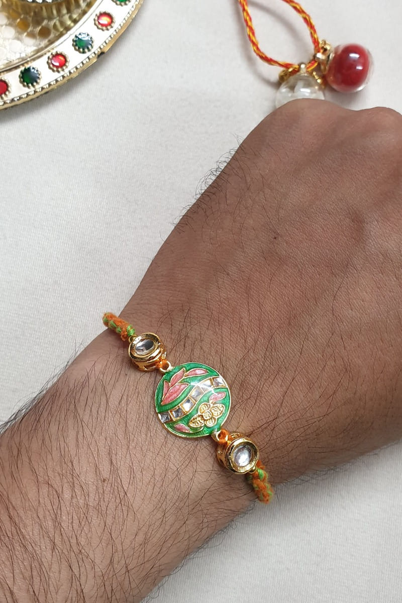 Jaipri designs this vivid rakhi for your brother rendered in brass encapsulated with intricate meenakari work and kundan embellishments in a floral shape. It is paired with a roli-chawal.