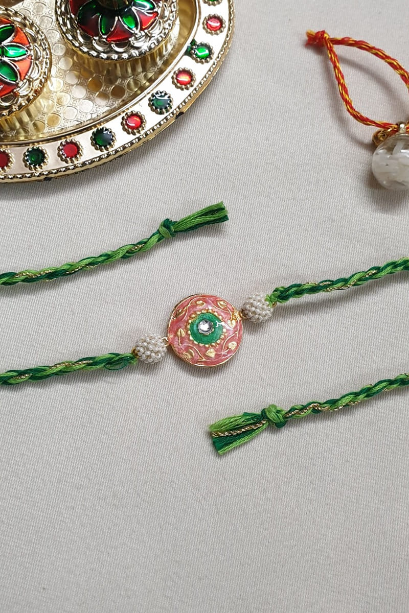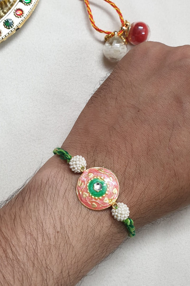 Jaipri designs this ethereal rakhi for your brother customised in brass encrusted with intricate kundan and meenakari work featuring delicate embellishments. It is teamed with a roli-chawal.
