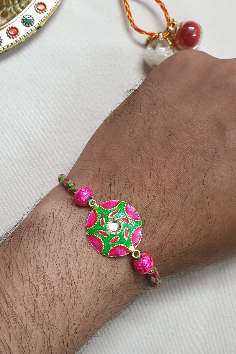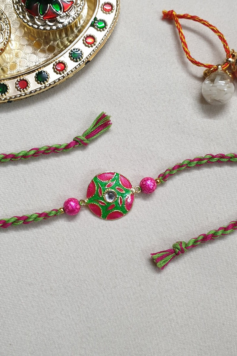 Jaipri designs this vibrant rakhi for your brother crafted in brass adorned with intricate kundan and meenakari work featuring pink bead embellishments. It is paired with a roli-chawal.