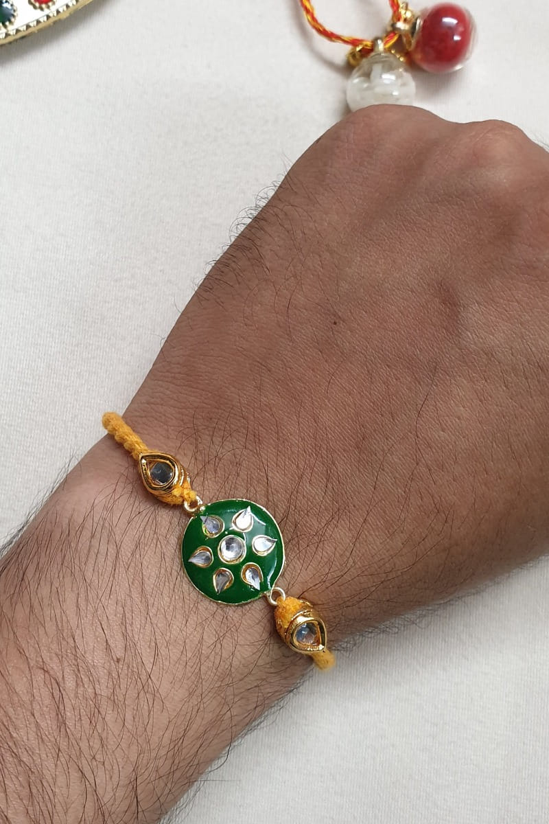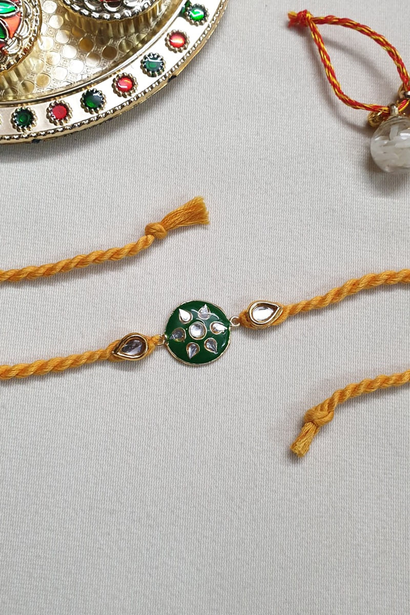 Jaipri designs this occasion-ready rakhi for your brother crafted in brass adorned with intricate kundan and meenakari work in a floral shape. It is teamed with a roli-chawal.