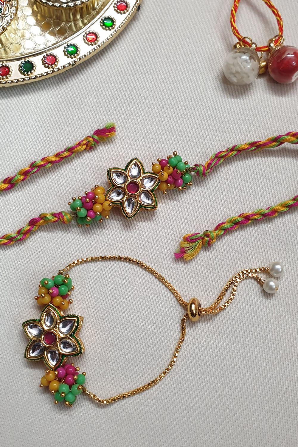Jaipiri designs this pair of captivating rakhis for your brother and sister-in-law crafted in brass studded with kundan, stone and bead embellishments in a floral shape. They are teamed with a roli-chawal.