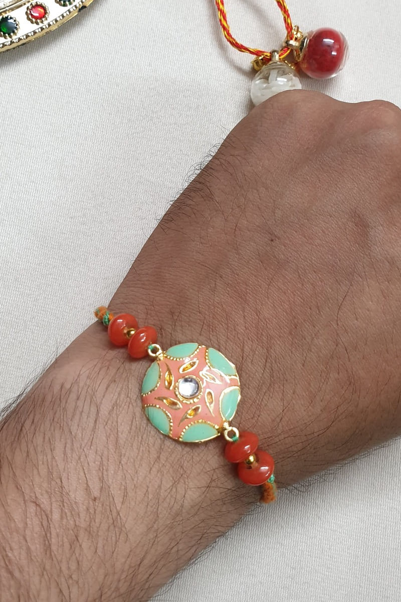 Jaipri designs this gorgeous rakhi for your brother embraced in brass laden with intricate kundan and meenakari work featuring red bead embellishments. It is paired with a roli-chawal.