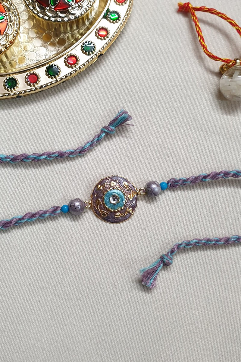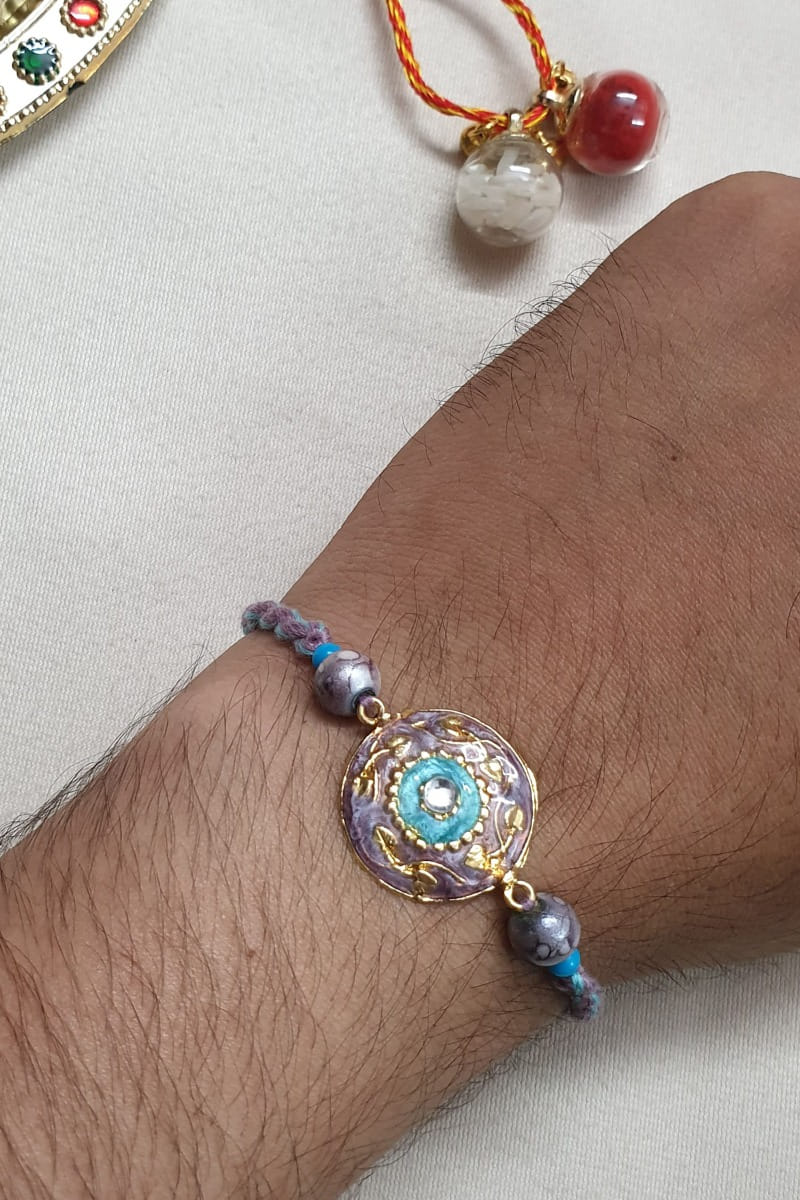 Jaipri designs this opulent rakhi for your brother crafted in brass adorned with intricate kundan and meenakari work featuring purple bead embellishments. It is paired with a roli-chawal.