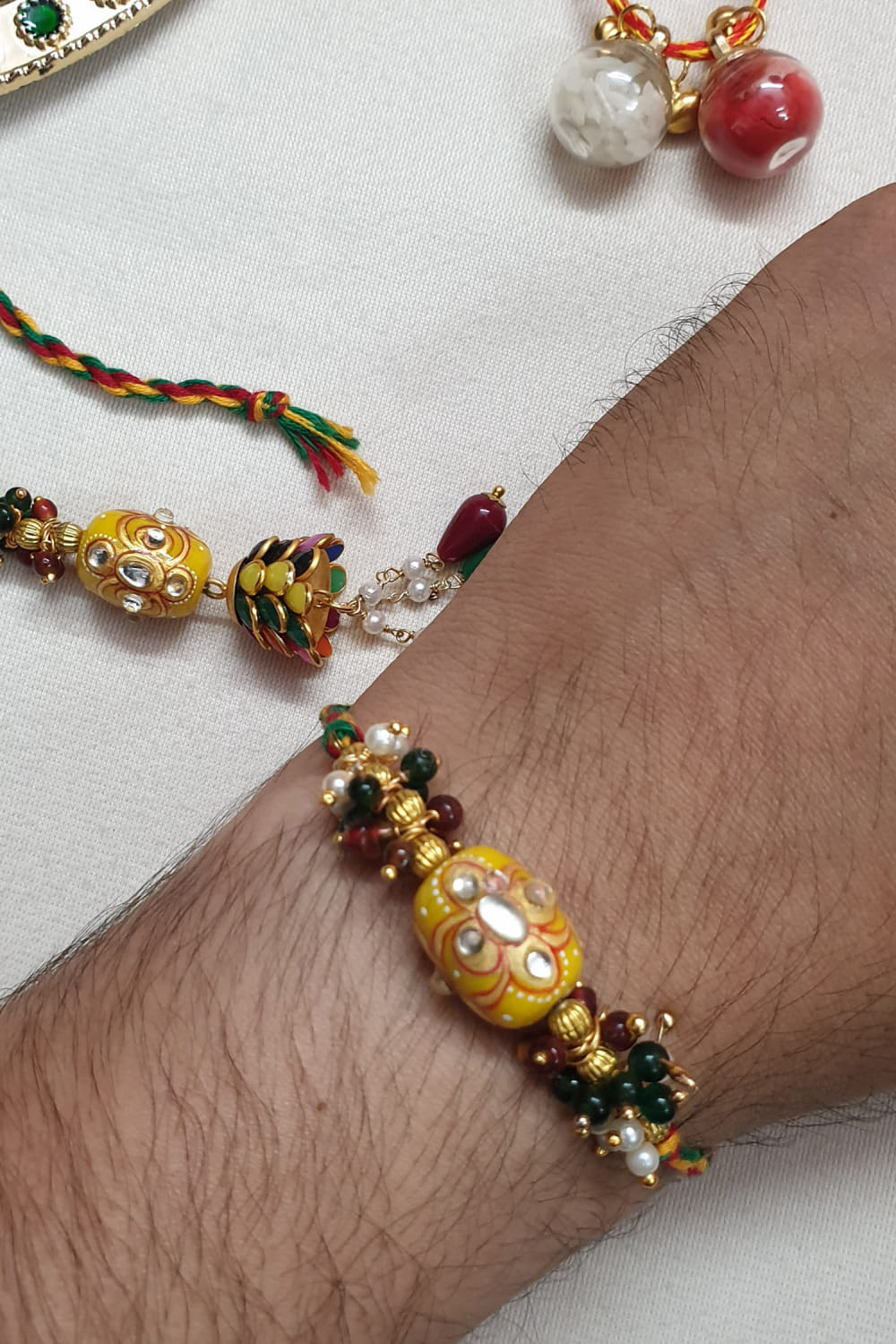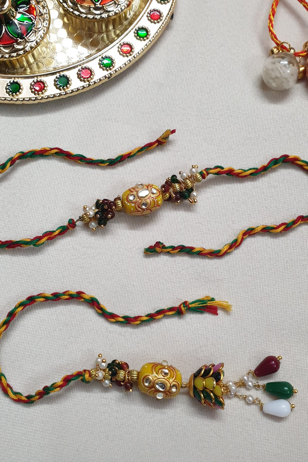 Jaipiri designs this pair of vibrant rakhis for your brother and sister-in-law crafted in brass with adorned with kundan, bead and pearl embellishments. They are teamed with a roli-chawal.