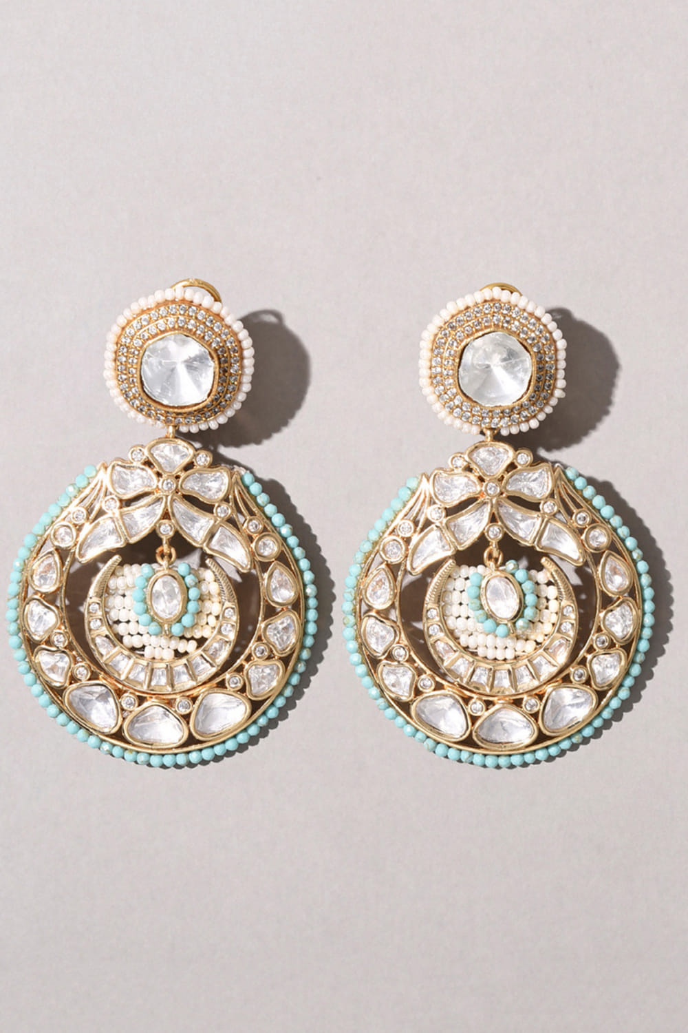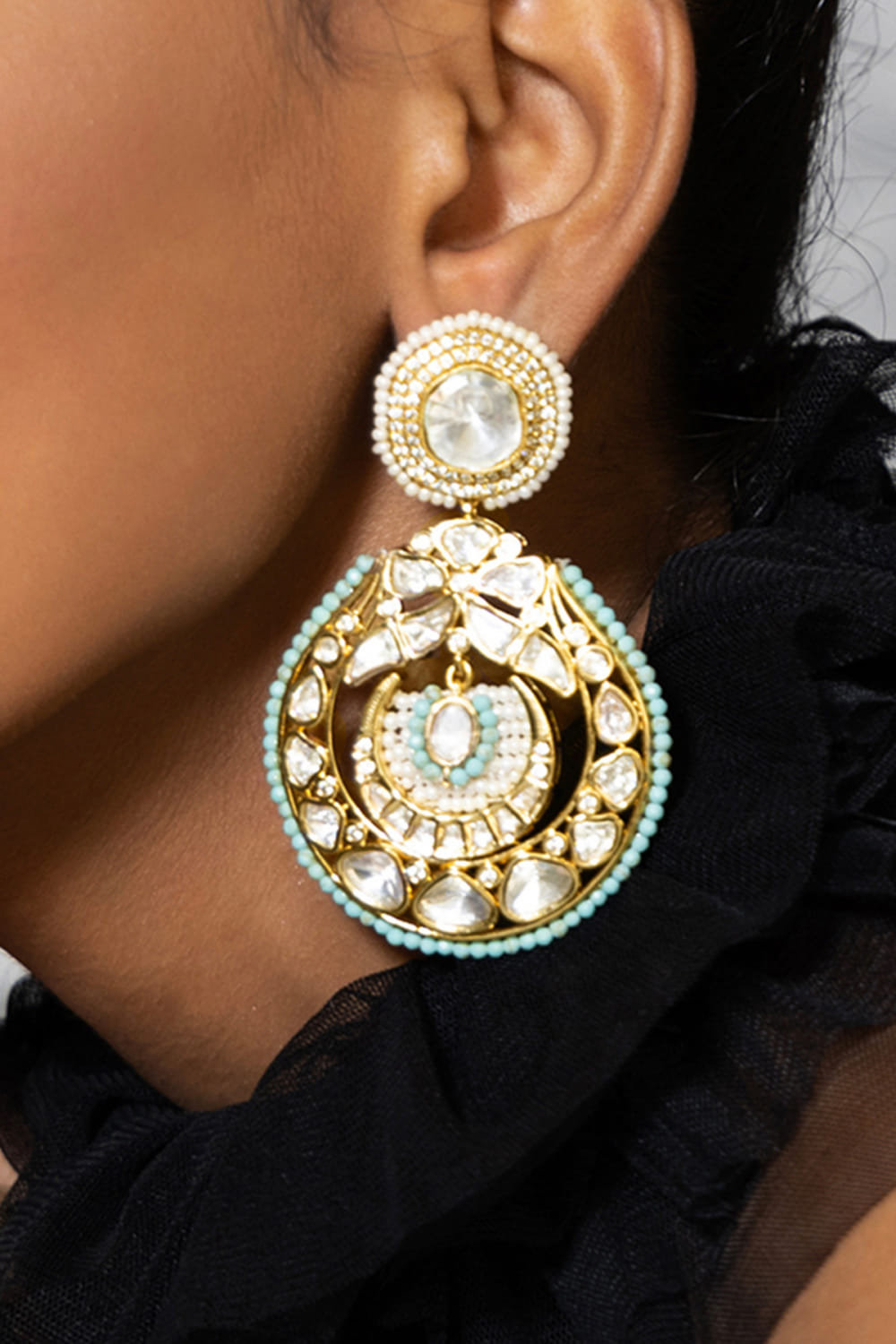 Joules by Radhika designs this admirable pair of drop earrings crafted in 22kt gold plated on brass embellished with hydro polki, pearl and turquoise bead detailing. Style them with your traditional wear.