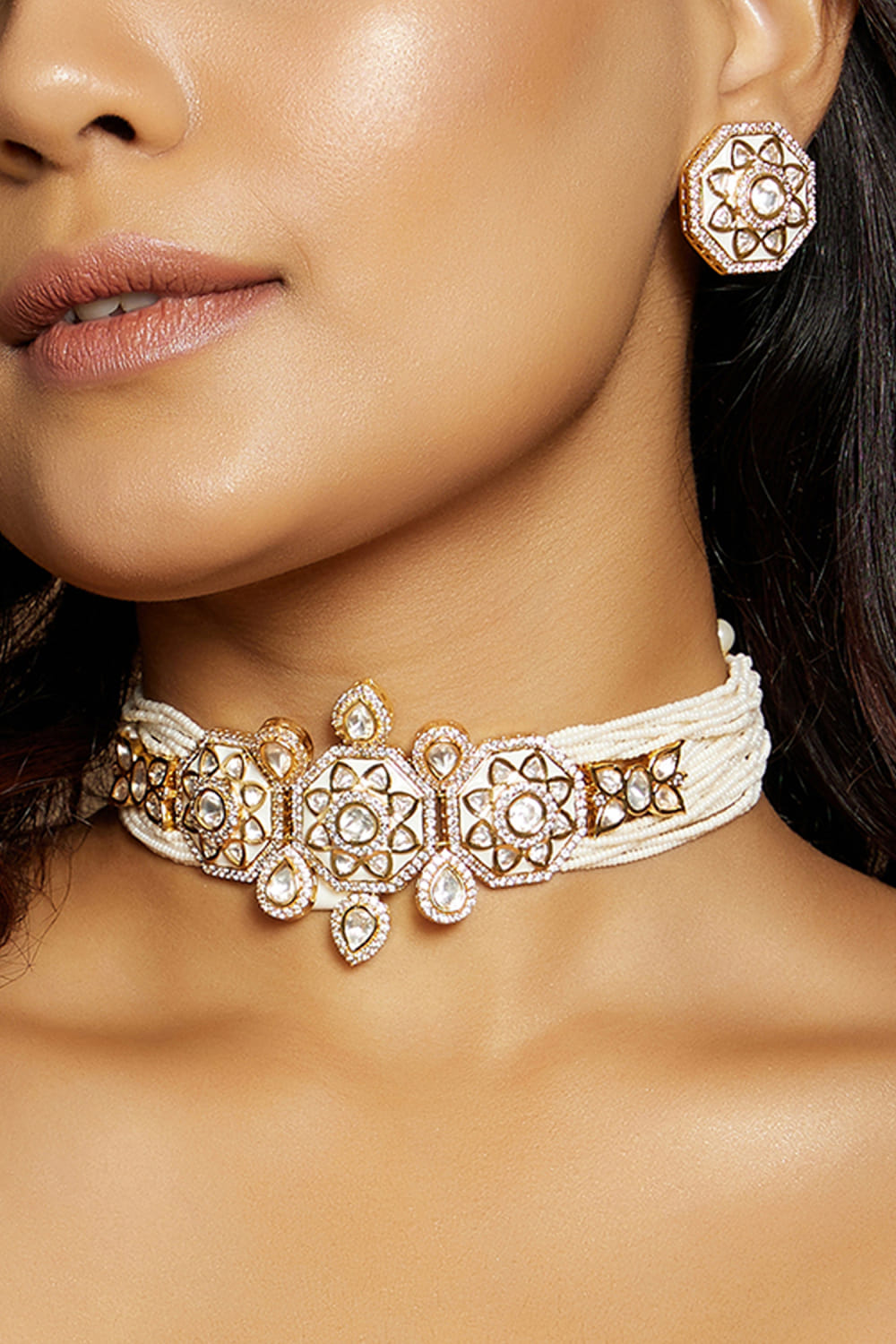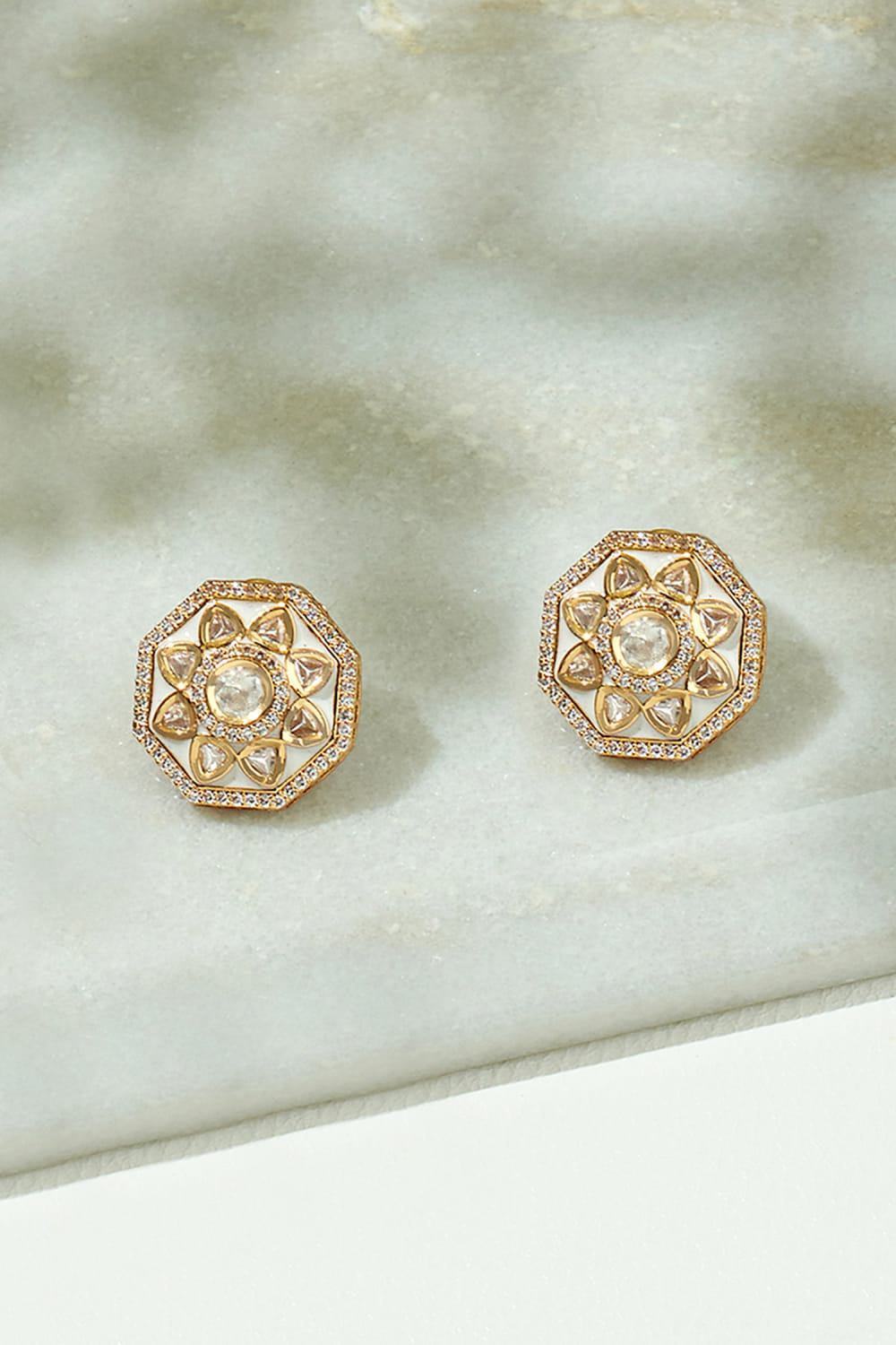 Joules by Radhika designs this opulent pair of studs in gold-plated brass embedded with pearl, kundan and polki embellishments in octagon and floral shapes. Style them with an angrakha set for a stunning impression.