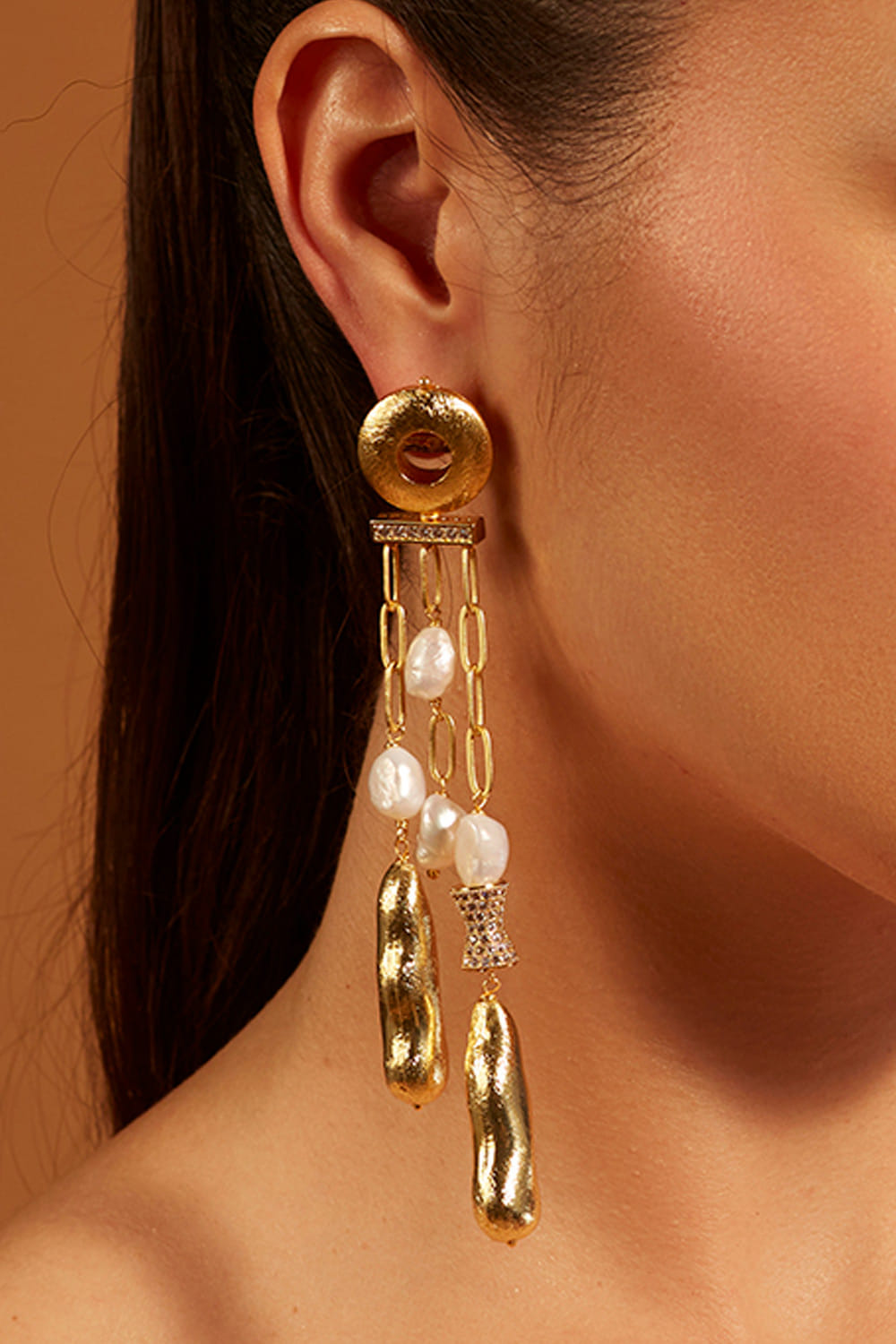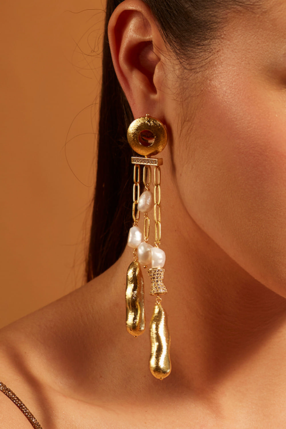 Joules by Radhika designs this modern pair of tassel earrings enriched with gold chunk element, lustrous pearl and link chain detailing, finished with micron plating. Style them with party wear.