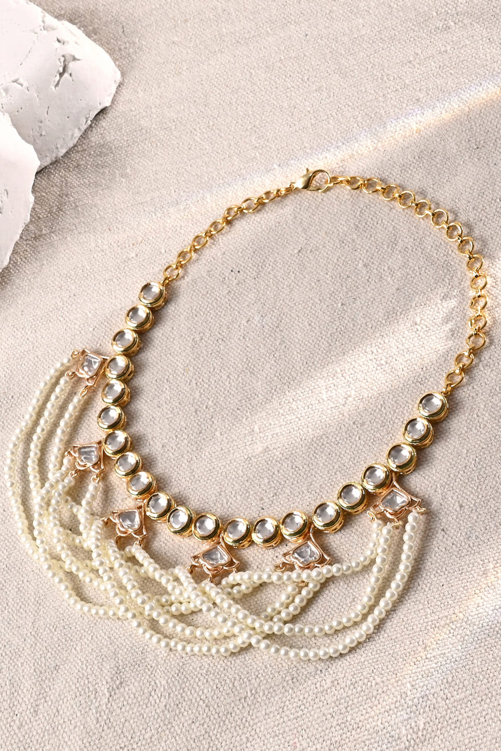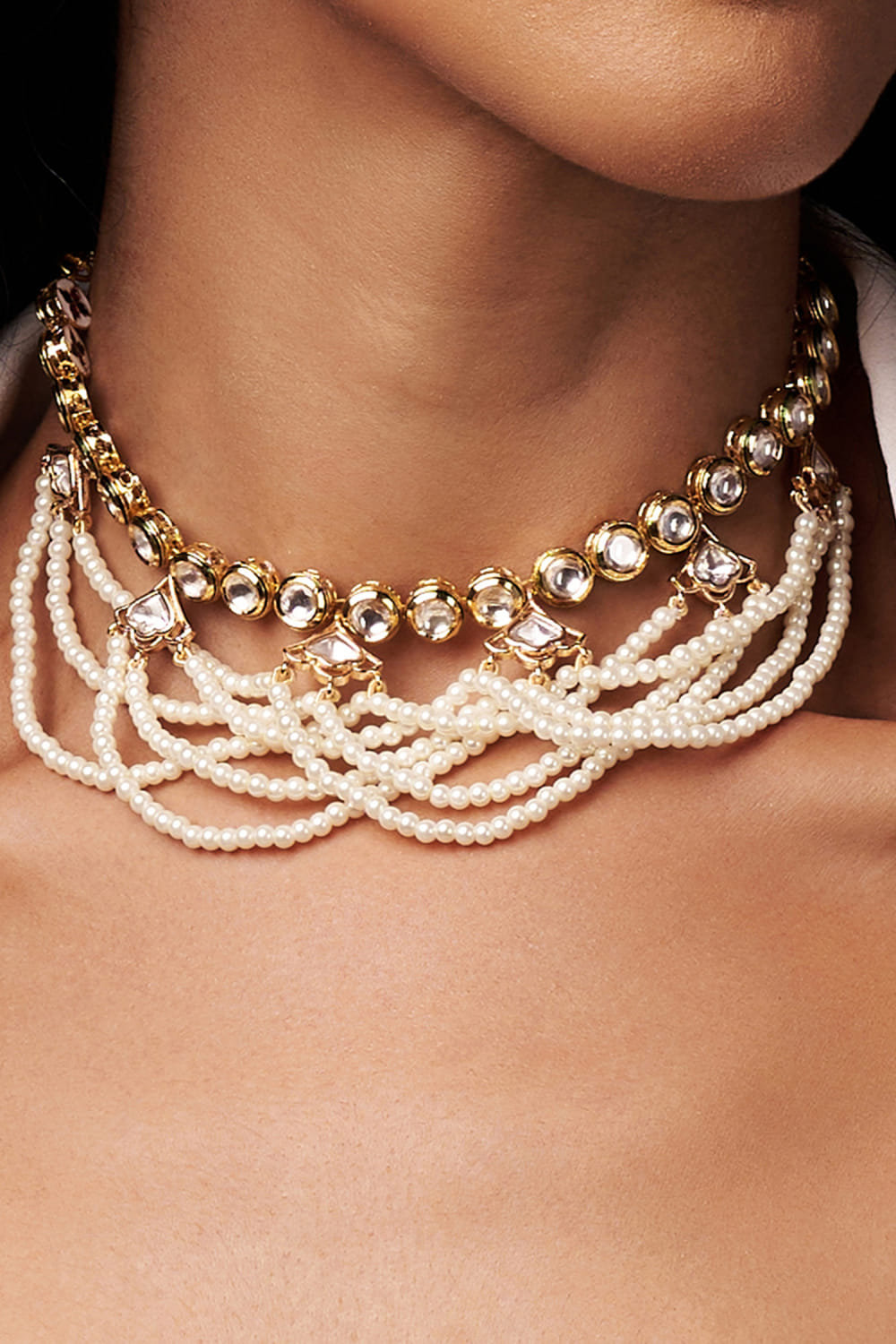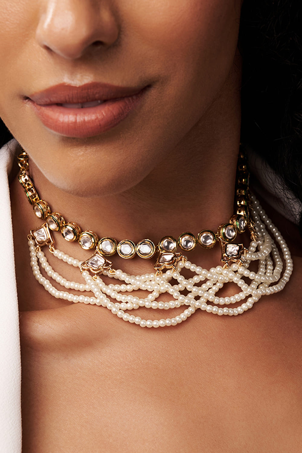 Joules by Radhika designs this enchanting gold finish necklace encapsulated with pearls, kundan and polki detailing. Style it with a draped lehenga ensemble for the occasion.
