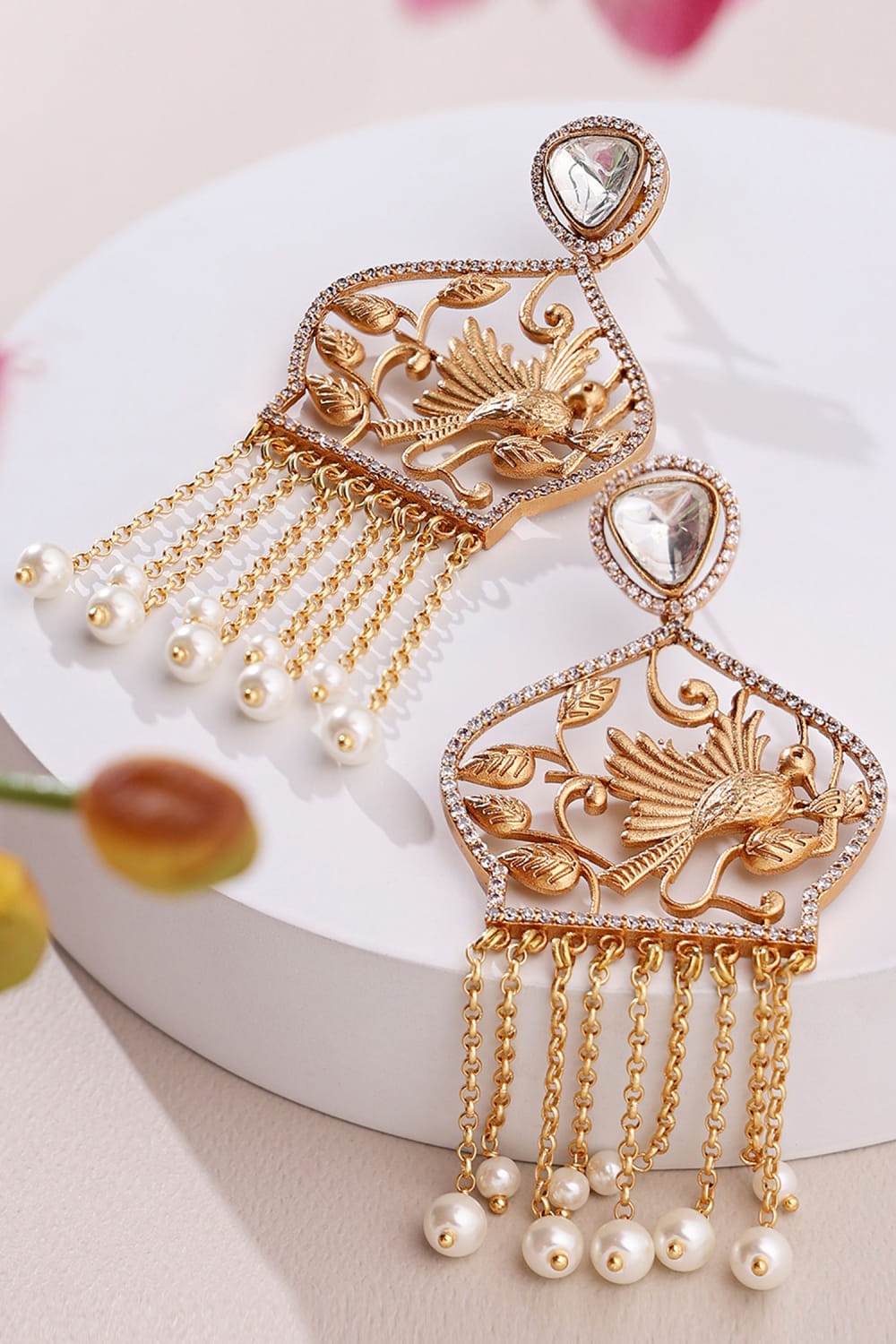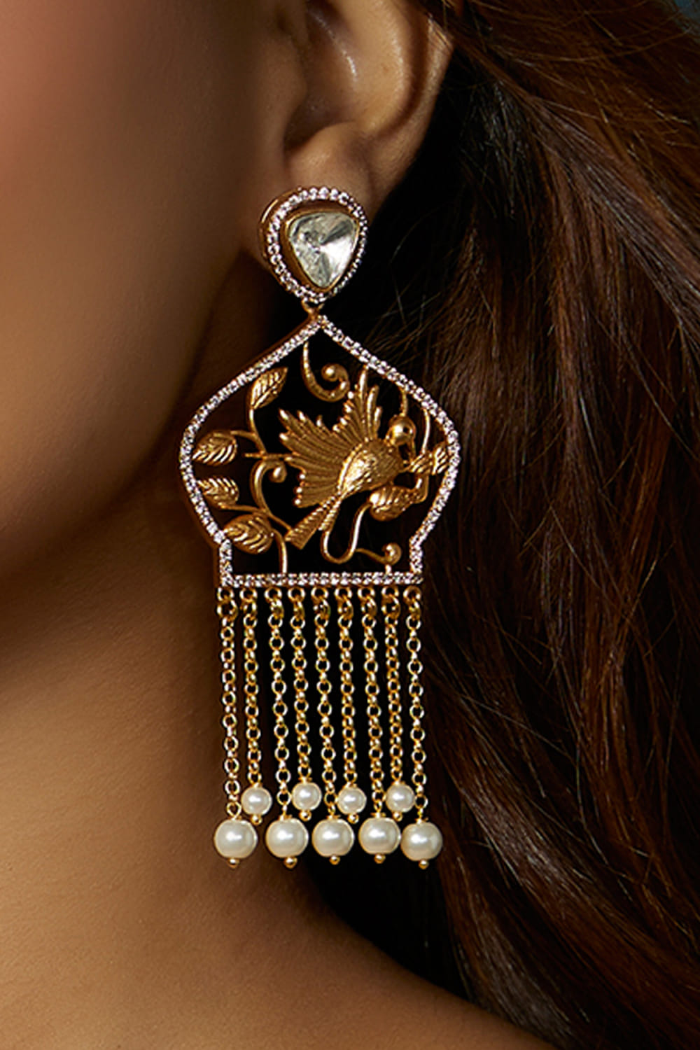 Joules by Radhika designs this ethereal pair of danglers in brass encased with bird accents, polki, Austrian zirconia, pearl beads and layers of chains in a gold finish. Style them with an ivory sari set for a festive affair.