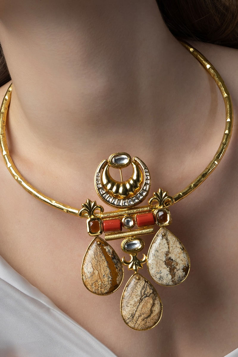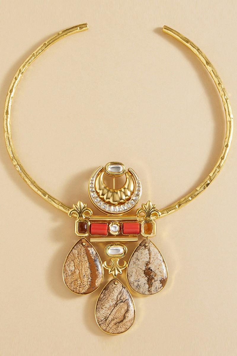 Joules by Radhika designs this statement-making torque necklace crafted in gold-plated brass embedded with stone embellishments in teardrop and crescent moon shapes. Style it with a cape set for a striking impression.