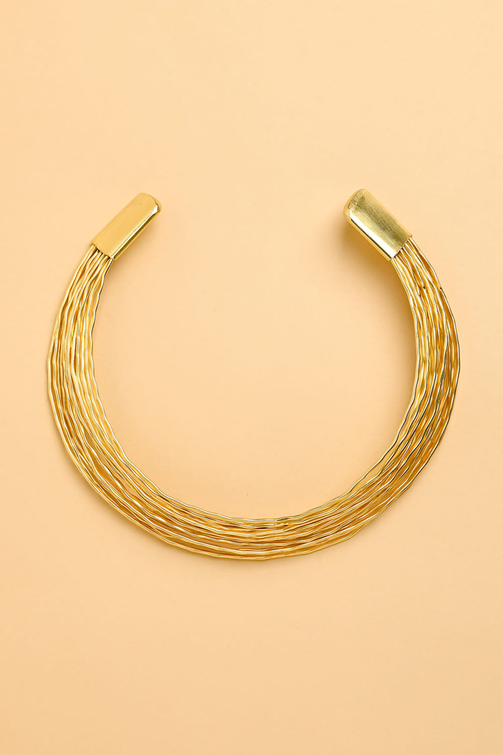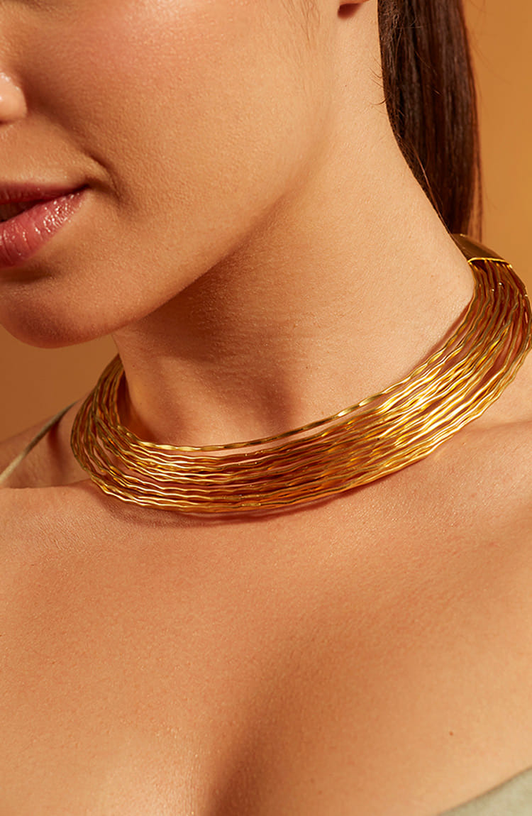 Joules by Radhika designs this statement-making torque collar necklace rendered in micron gold-plated brass with viking weave detailing. Style it with a draped gown for a distinctive look.