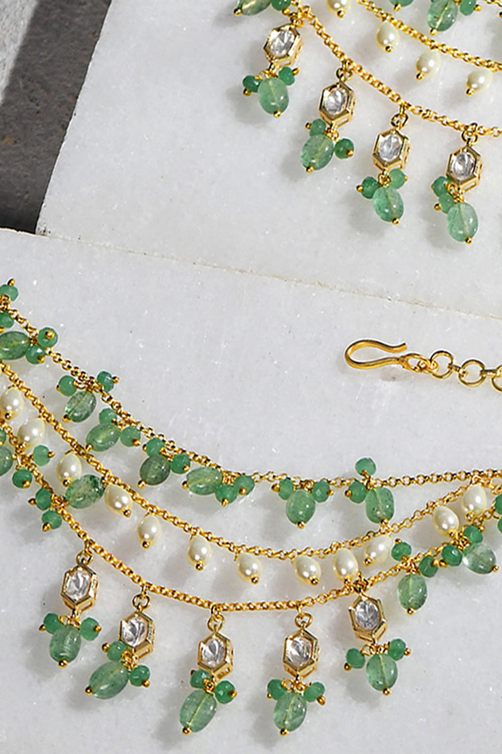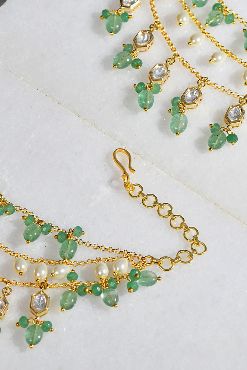 Joules by Radhika designs this stunning pair of ear chains in 22kt gold-plated brass studded with agate drops, glossy pearls, hydro kundan and polki embellishments. Style them with a peplum and gharara set for a wedding appeal.