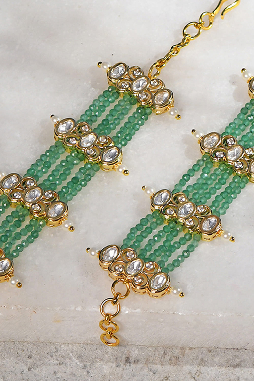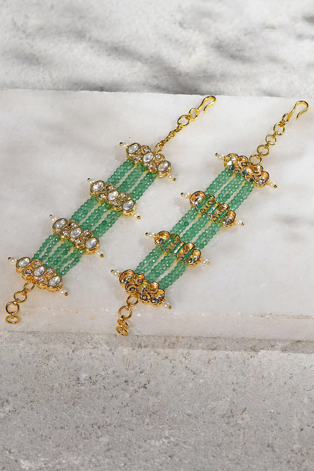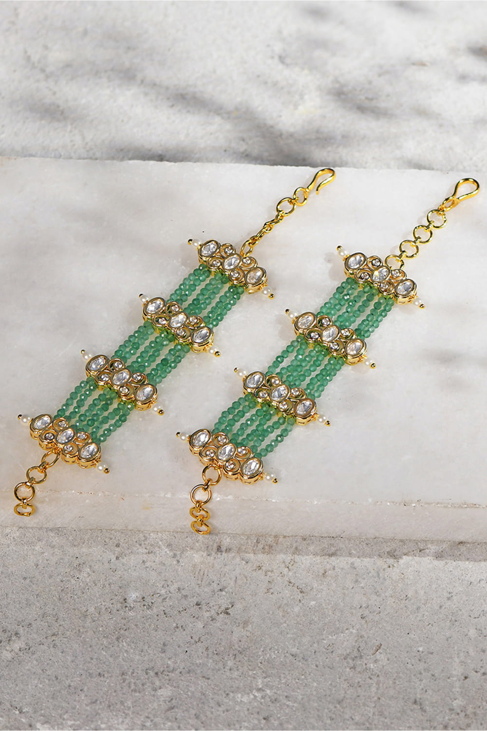 Joules by Radhika designs this vibrant pair of ear chains rendered in 22kt gold-plated brass with agate beads, hydro kundan and polki embellishments. Style them with a gharara set for a wedding update.