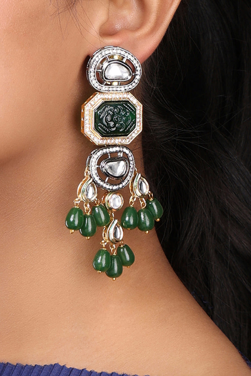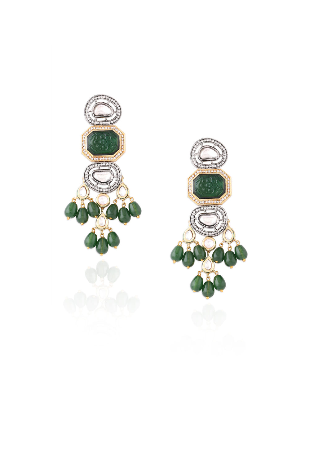 Joules by Radhika designs this pair of statement-making green drop earrings enriched with kundan polki stones. Style them with a benarasi sari.