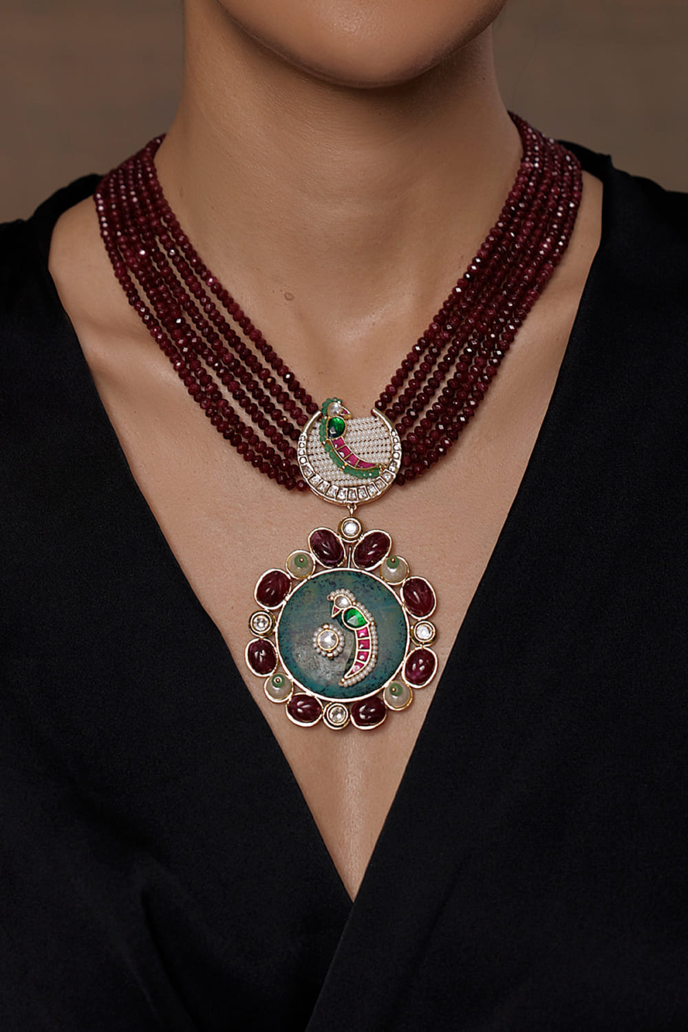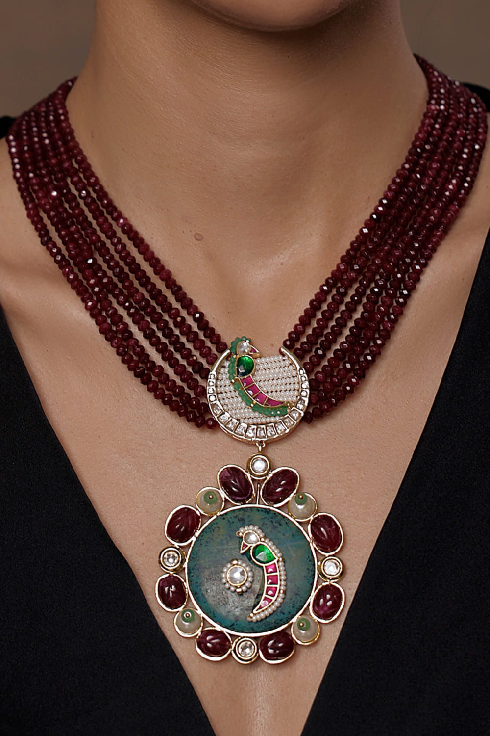Joules by Radhika designs this timeless necklace crafted in gold finish plating in brass encrusted with delicate bead embellishments. Style it with an opulent anarkali ensemble.