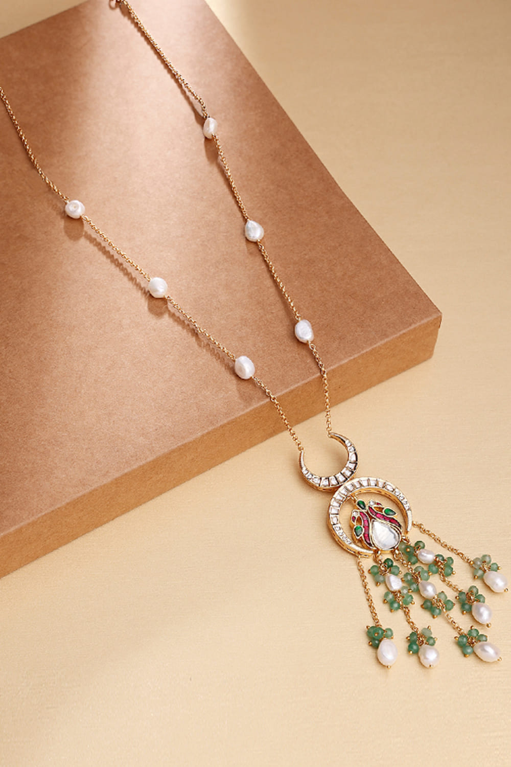 Joules by Radhika designs this statement-making gold-finished pendant necklace embellished with polki, multicolour fluoride stones and delicate freshwater pearl drop detailing. It is completed with micro gold plated brass chains. Style it with fusion wear for a regal look.