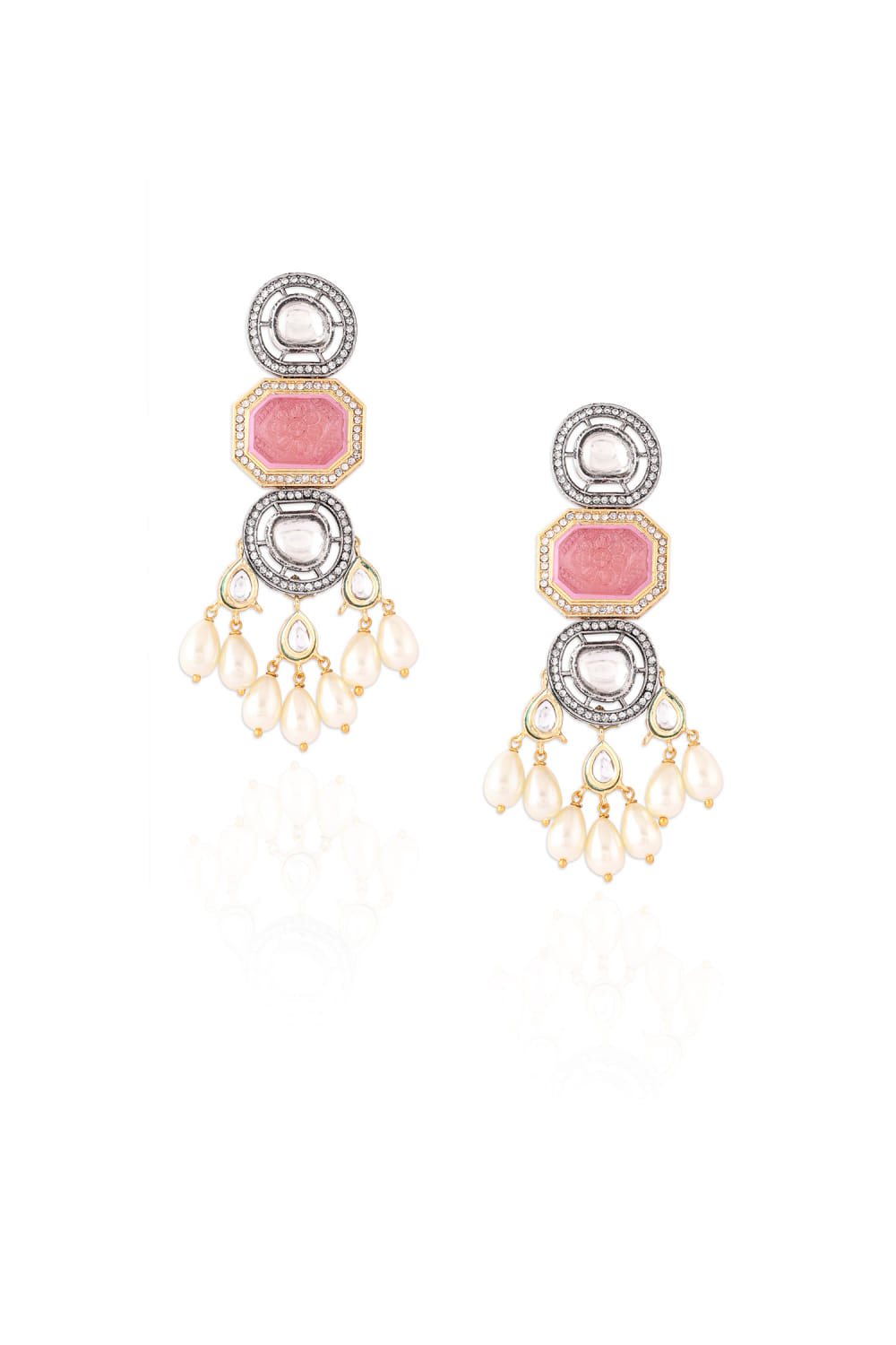 Joules by Radhika designs this pink exquisite pair of drop earrings in gold finish featuring kundan polki. Style them with a festive kurta set.
