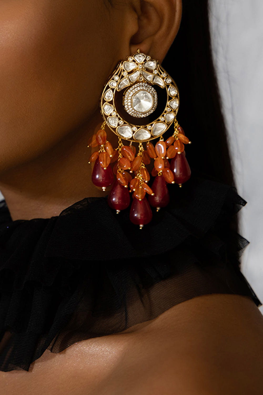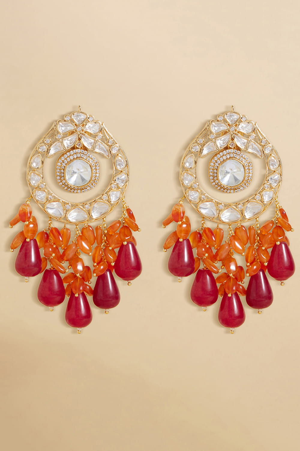 Joules by Radhika designs this whimsical pair of dangler earrings crafted in 22kt gold plated on brass enhanced with hydro polki, carnelian beads and red onyx embellishments. Style them with a bandhani kurta for the occasion.