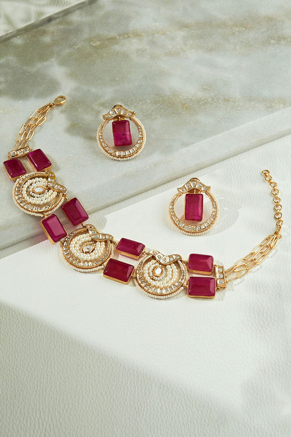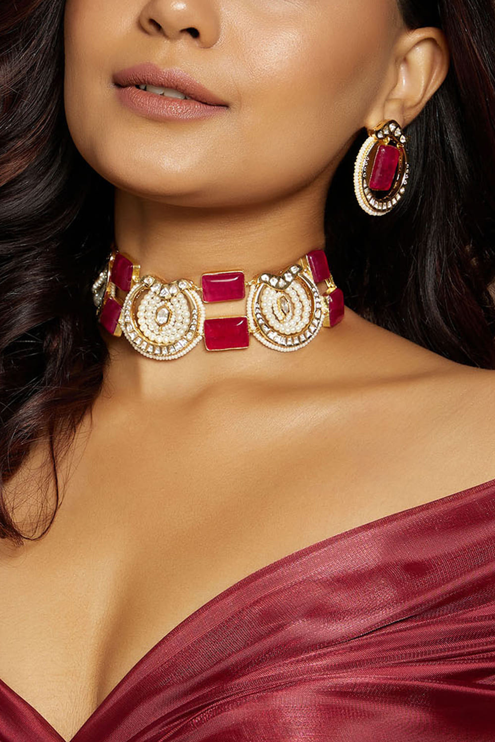 Joules by Radhika designs this regal brass choker laden in gold finish with faceted hydro ruby, layers of dainty pearls, kundan, polki and agate stone detailing, complementing it with matching studs. Style the set with an angrakha set.