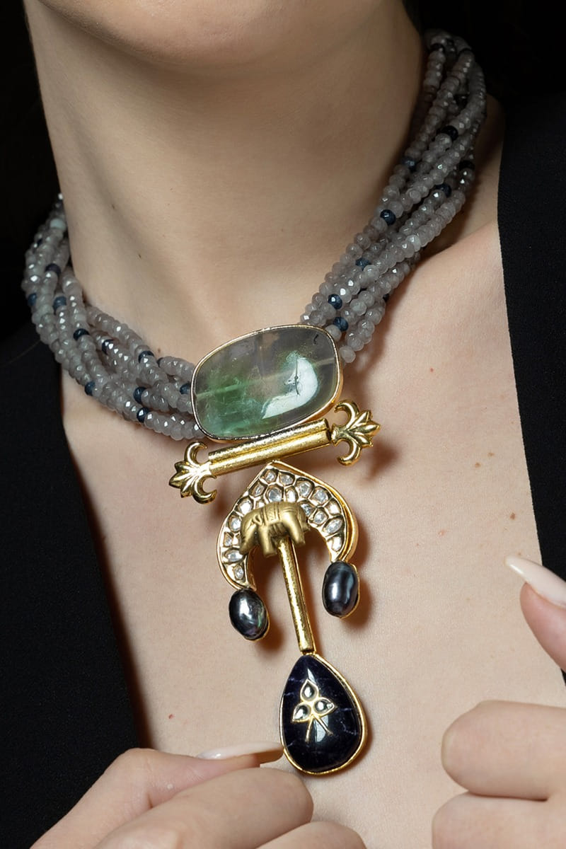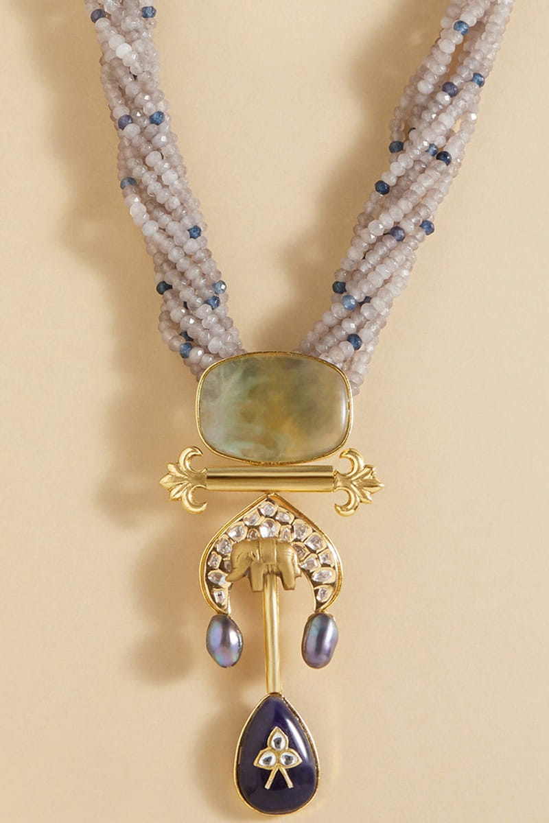 Joules by Radhika designs this captivating necklace crafted in gold-plated brass studded with agate beads and hydro polki embellishments in an elephant shape. Style it with a blazer set for a fusion look.