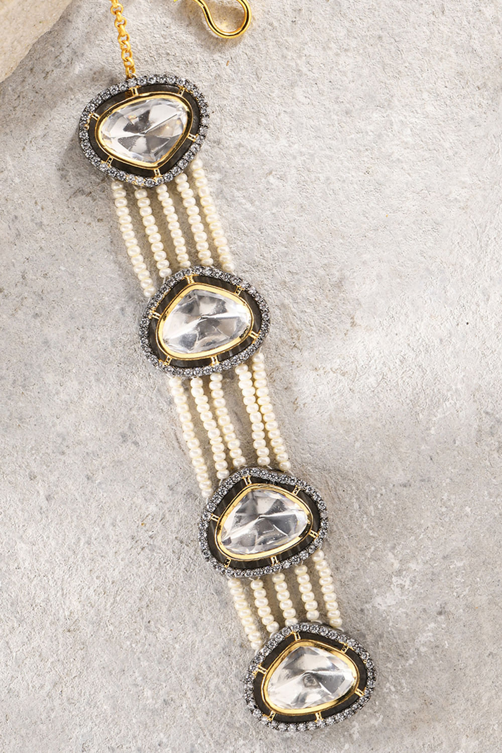 Joules by Radhika designs this eye-catching maang tikka crafted in 22kt gold-plated brass with delicate pearls, hydro kundan and polki embellishments. Style it with a chikankari embroidered lehenga set for wedding glam.