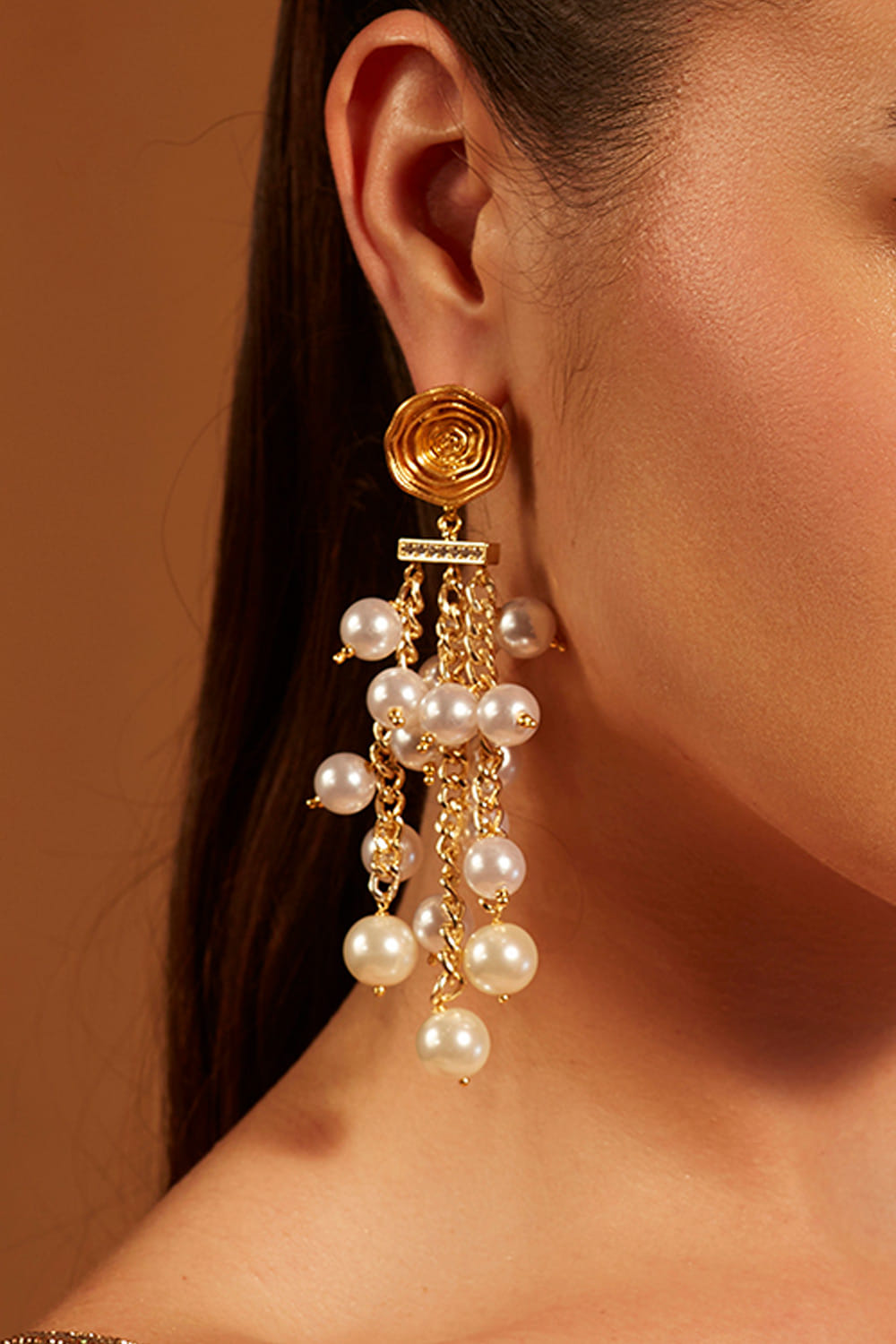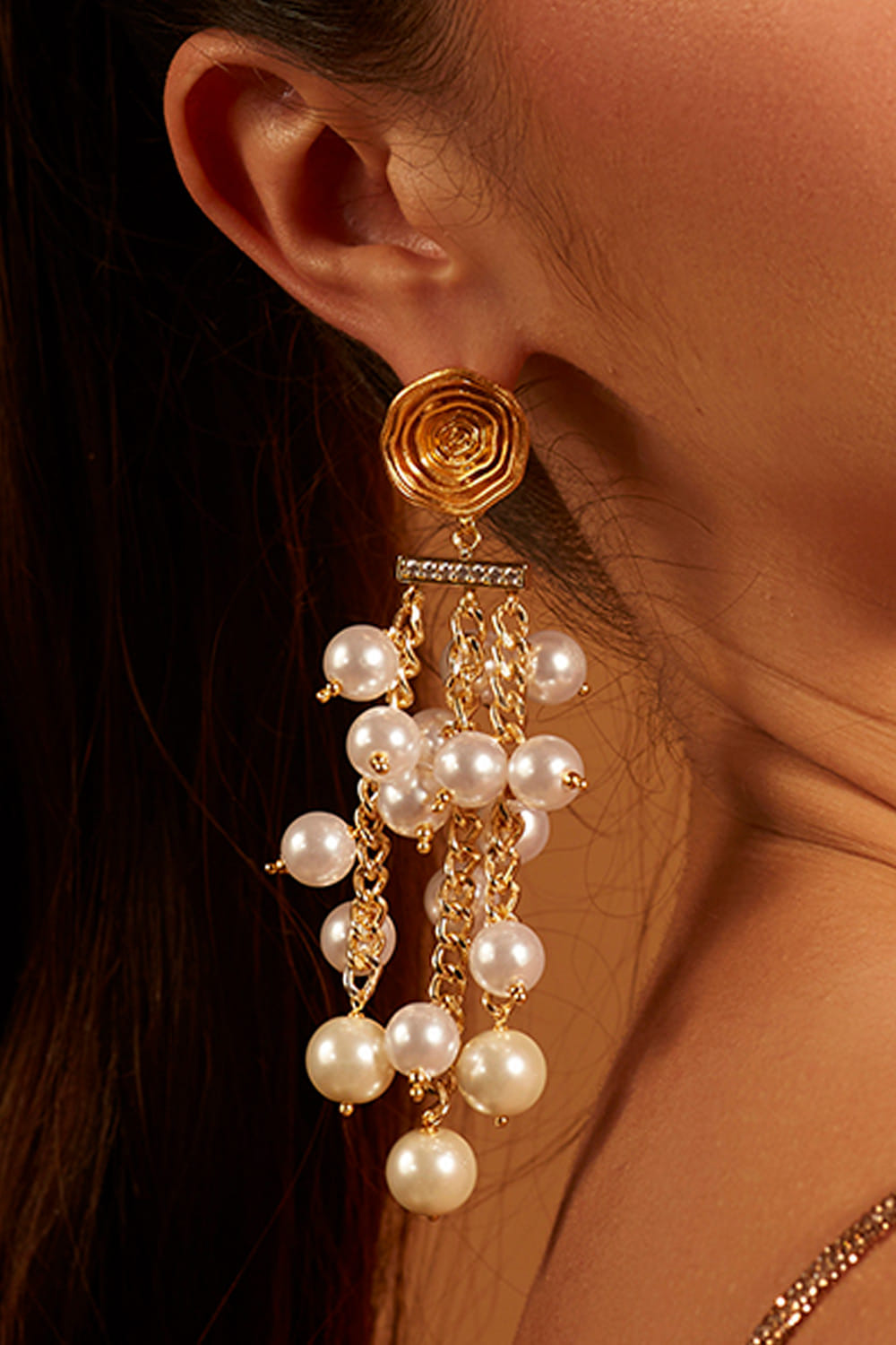 Joules by Radhika designs this captivating pair of earrings enhanced with delicate pearl strings and rose motif detailing, finished with micron plating. Style them with a pleated dress for luncheons.