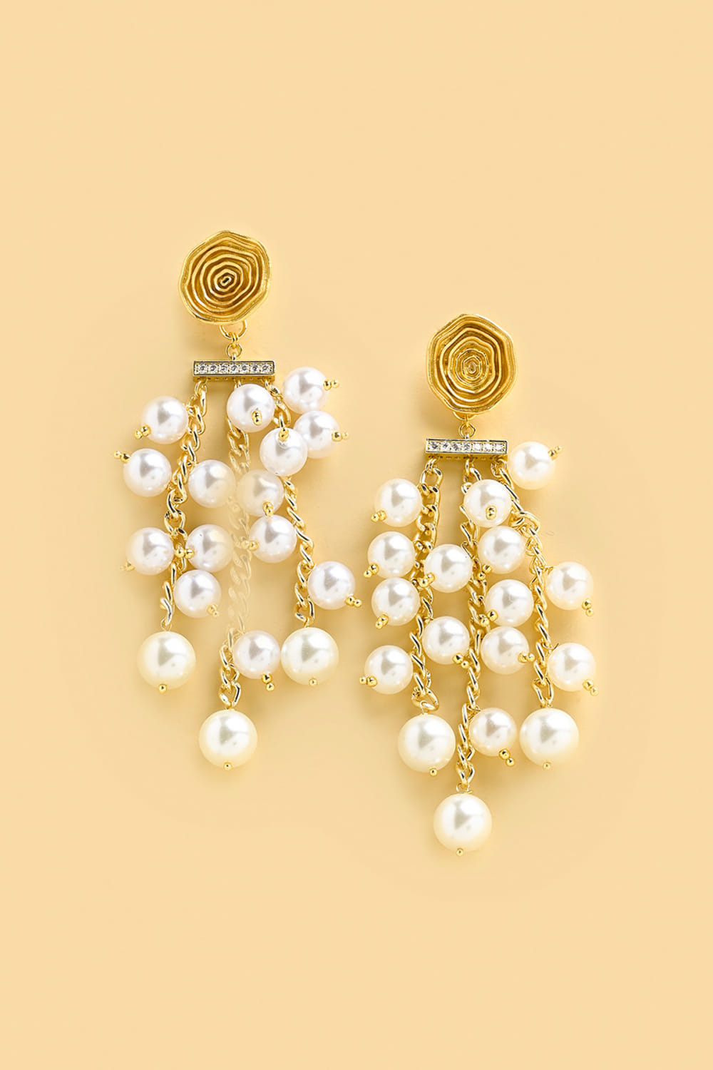 White pearl strings and rose earrings