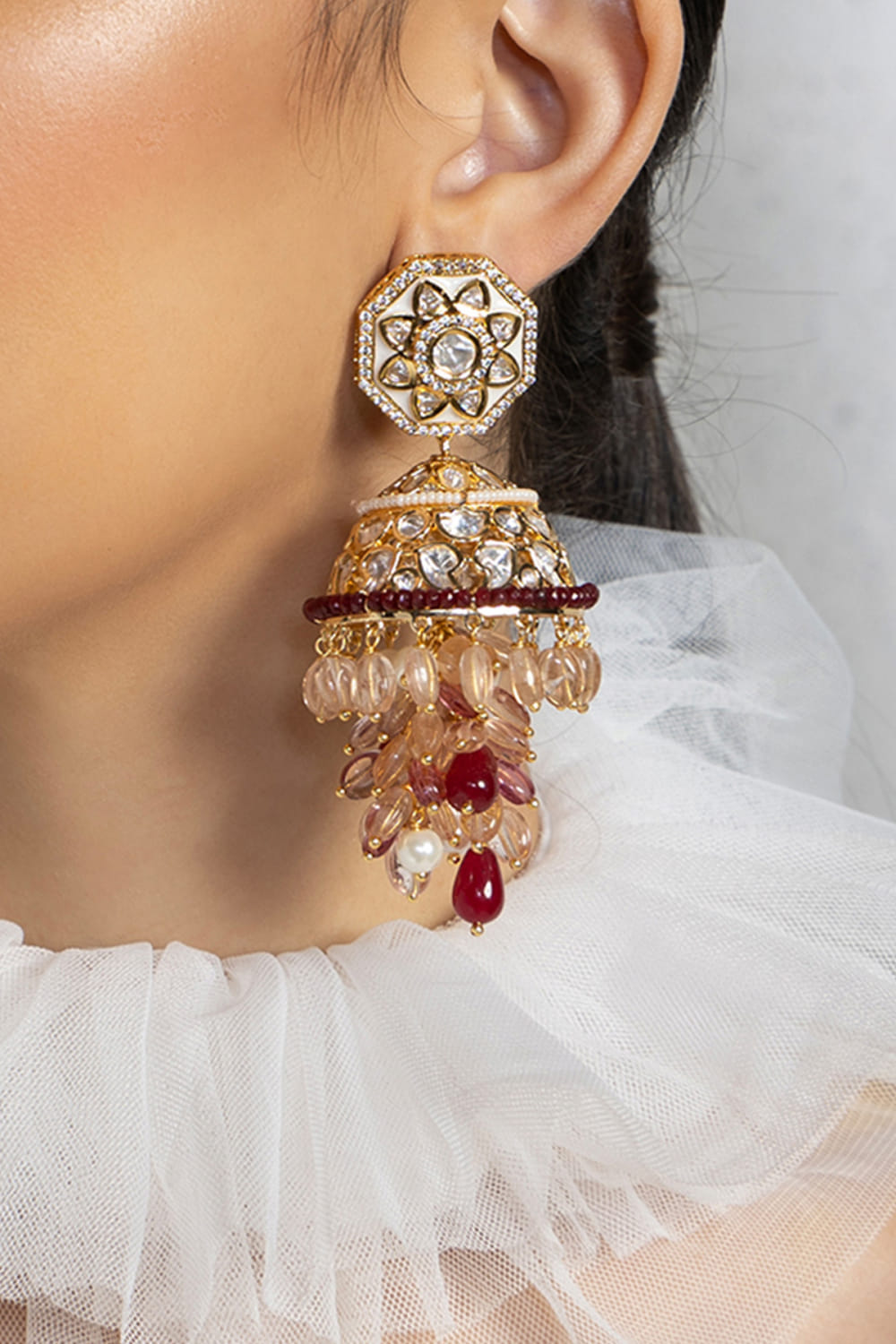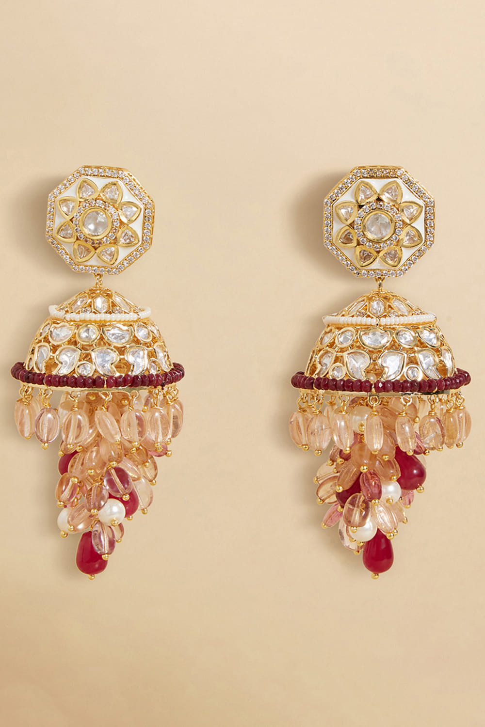 Joules by Radhika designs this elegant pair of jhumka earrings crafted in 22kt gold plated on brass with hydro polki, jade tumbles and pearl embellishments. Style them with a pastel lehenga ensemble.