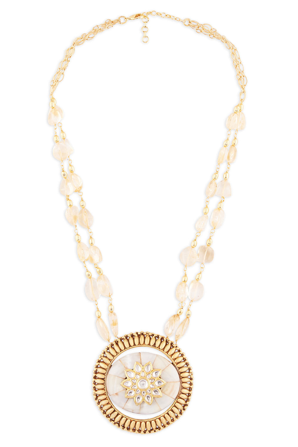 Joules by Radhika designs this floral gold finish necklace enhanced with mother of pearl, citrine tumbles, hydro polkis, jade drops and a carved bangle. Accessorise it with a gown for an eye-catching look.