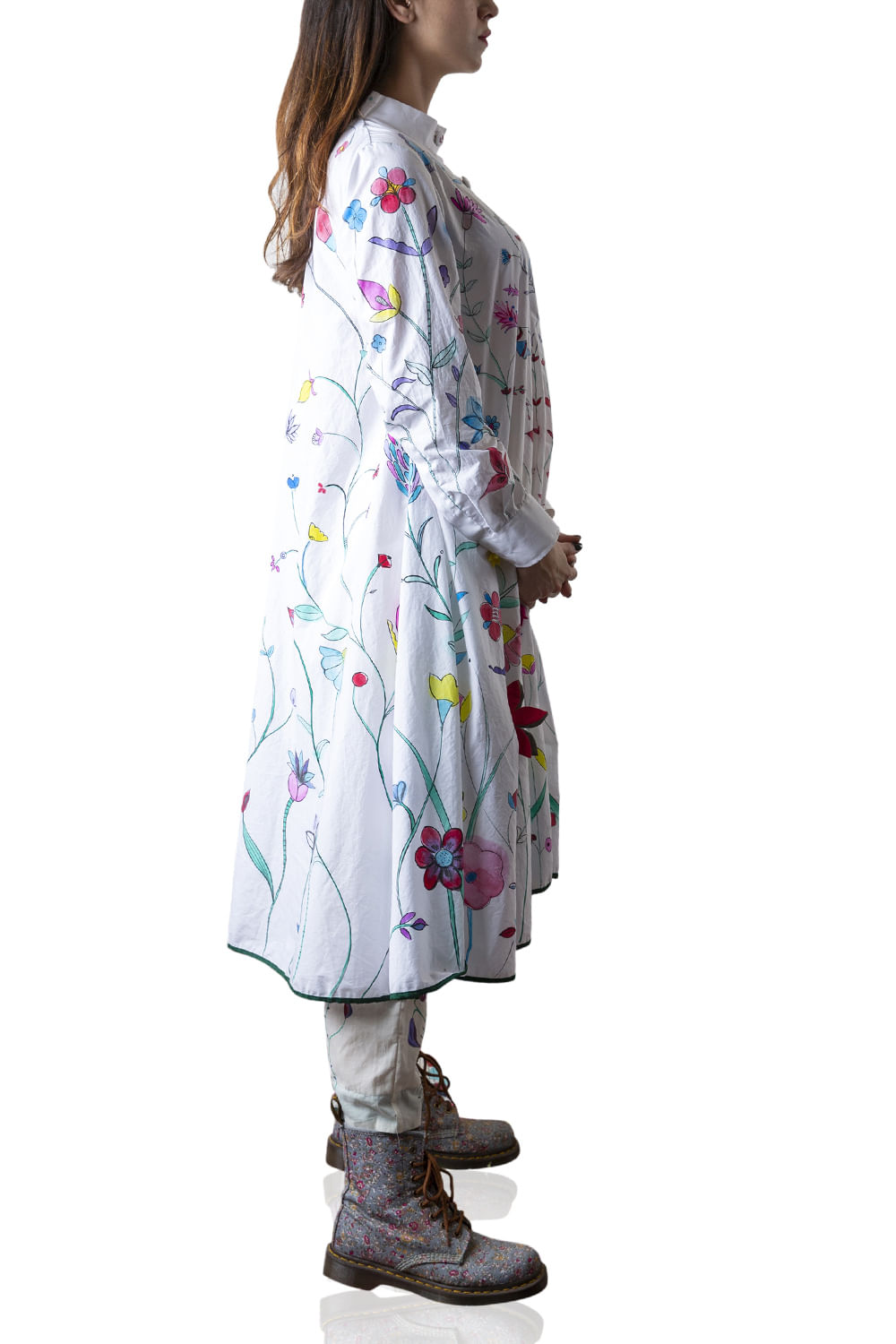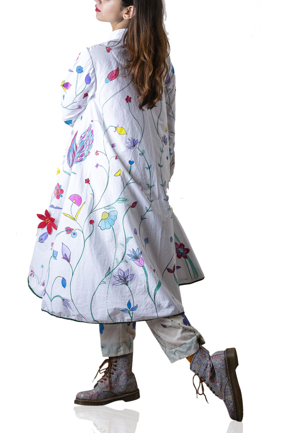 Ka-Sha designs a vibrant tunic with delicate hand-painting and floral applique, paired with coordinated pants. Style the look with a pair of hoops. The jacket is shown for styling purpose only.